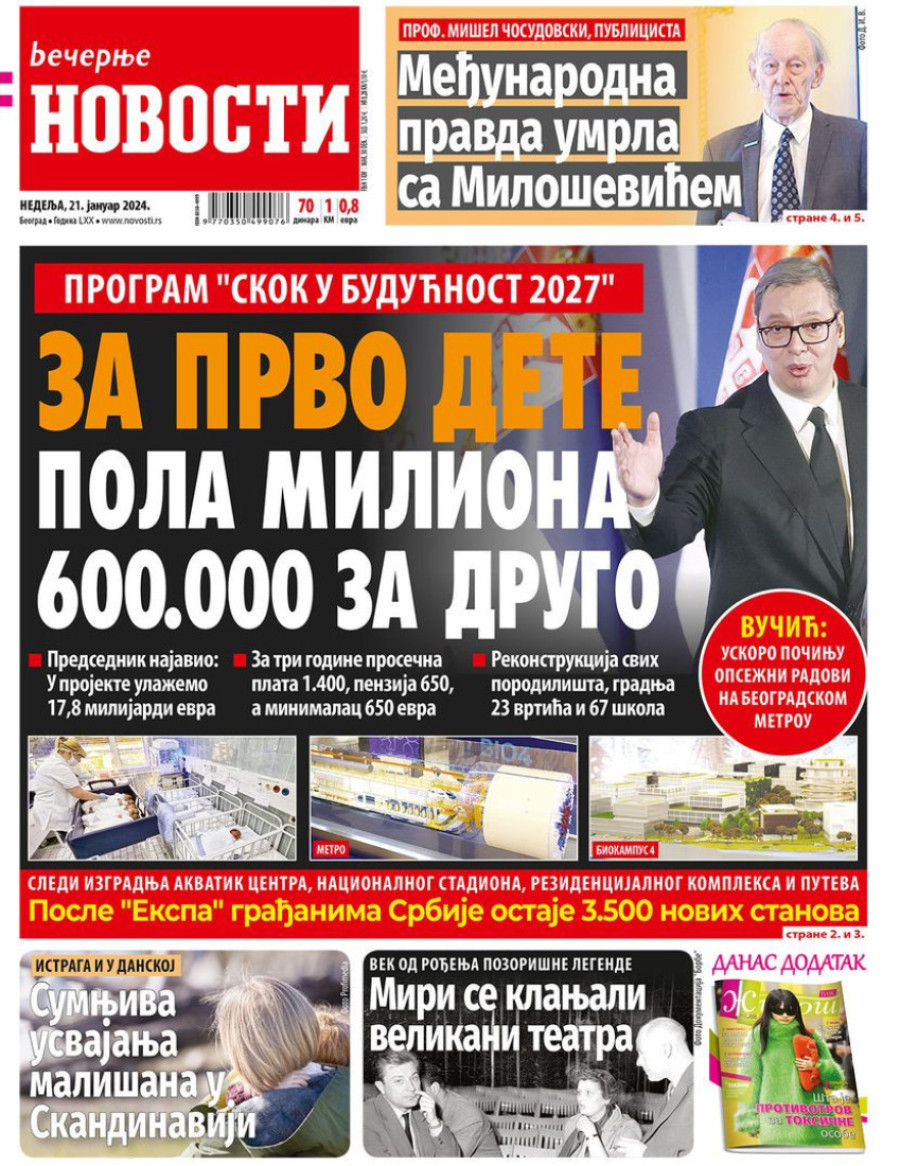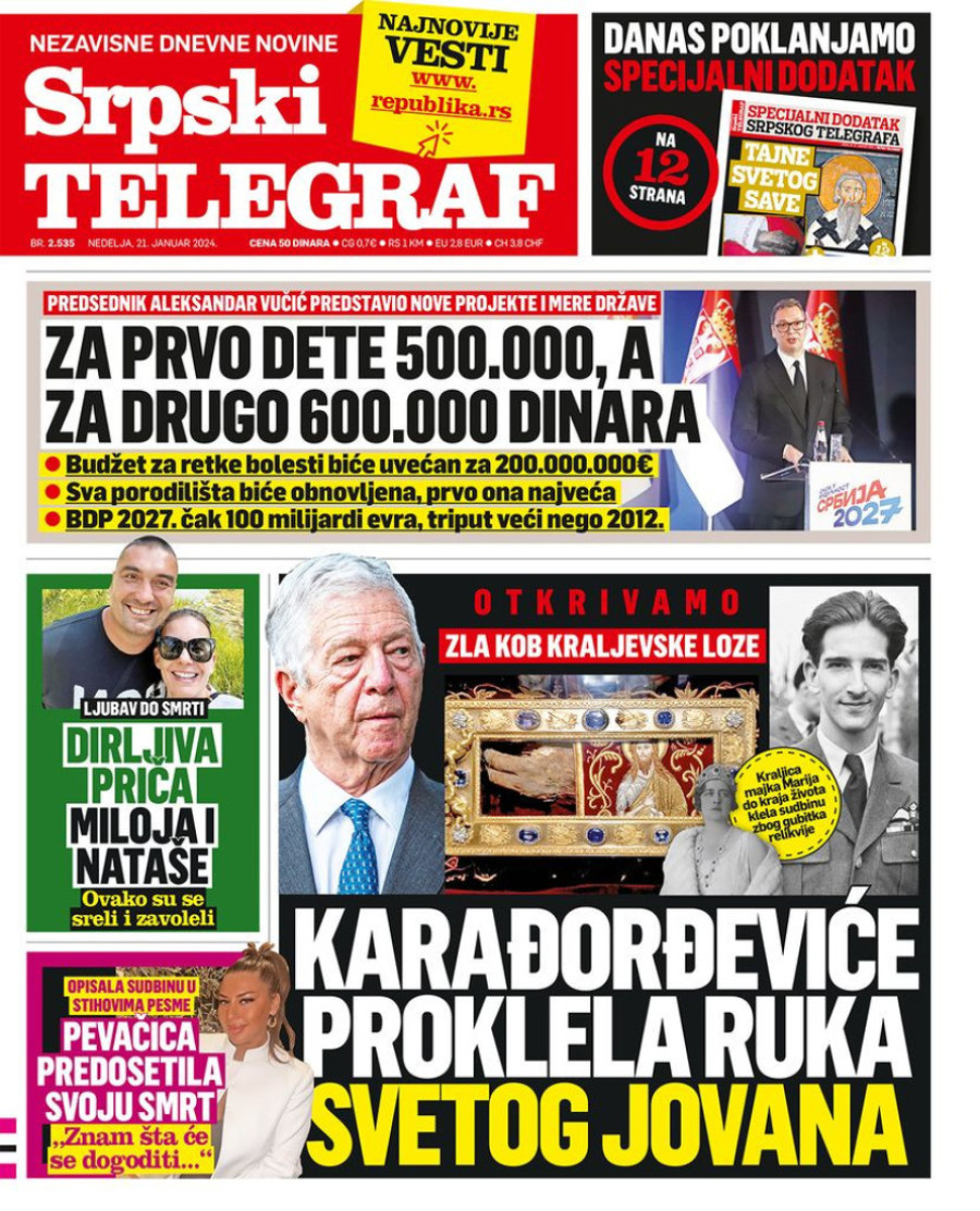Naslovne strane dnevnih novina: Prelistavanje štampe za 21. januar 2024. godine
