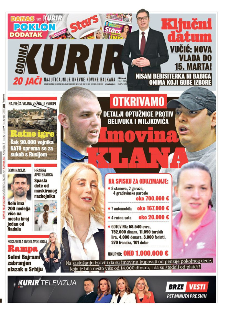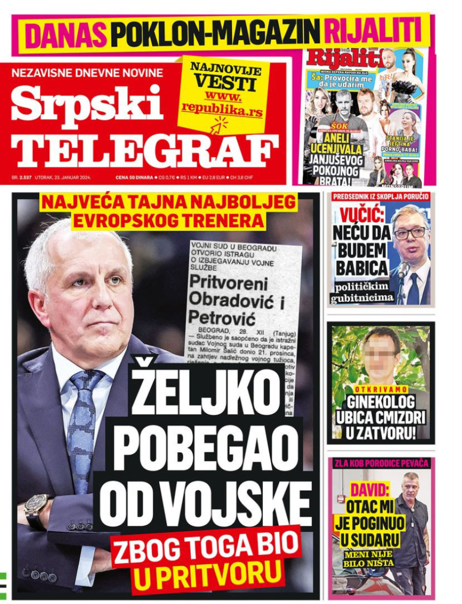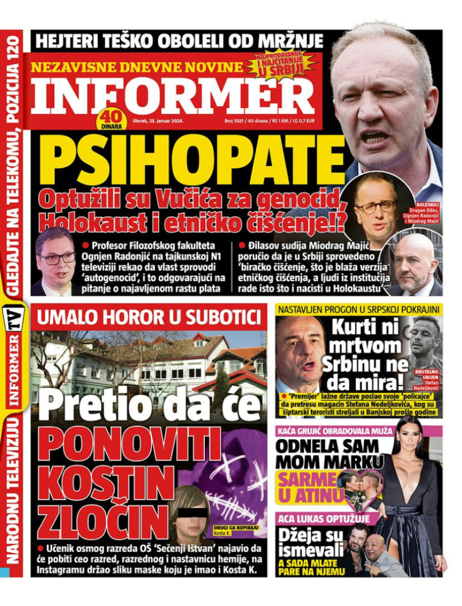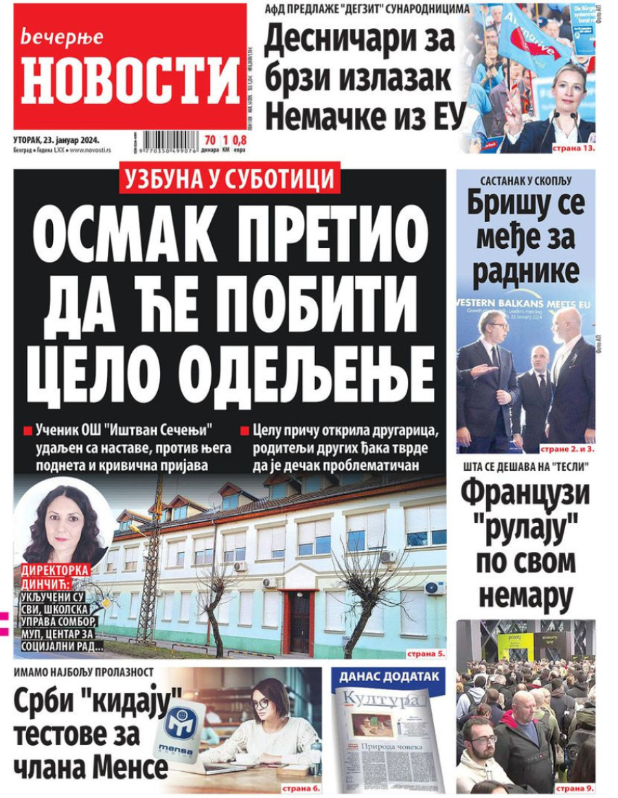 Dnevne novine u Srbiji za utorak 23. januar 2024. godine, na naslovnim stranama najavljuju brojne aktuelne društveno-političke teme.
