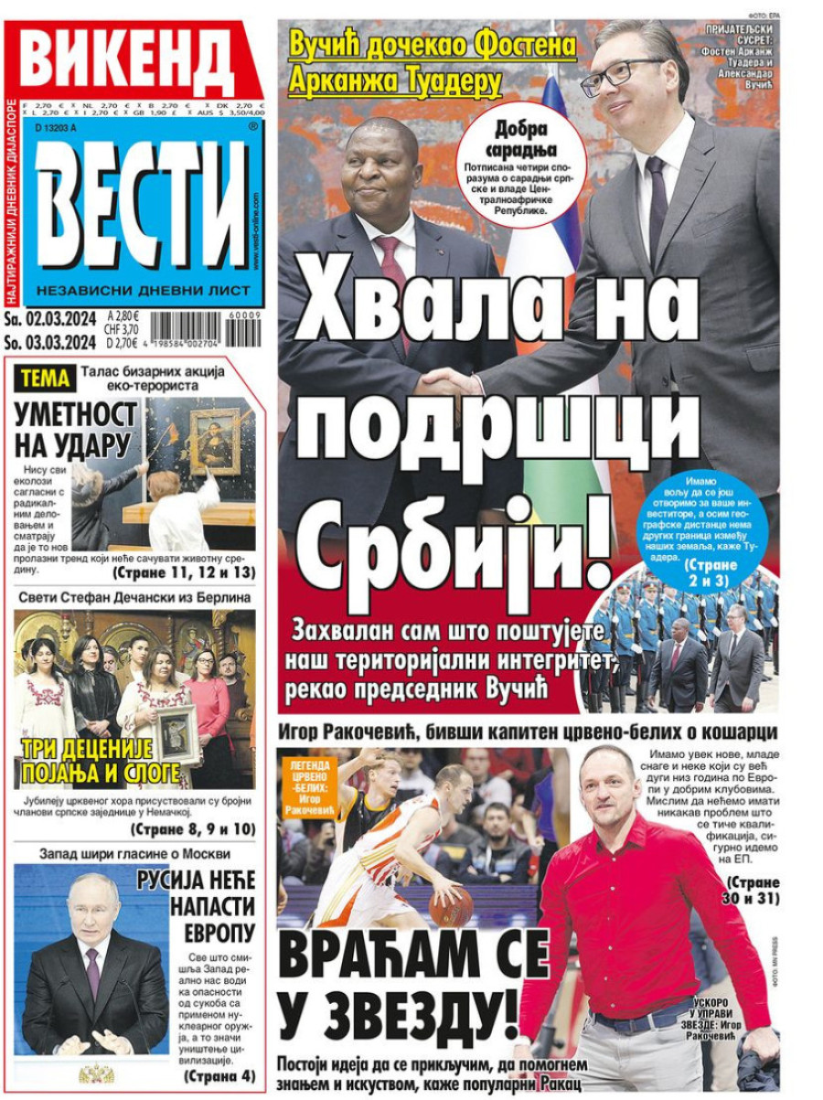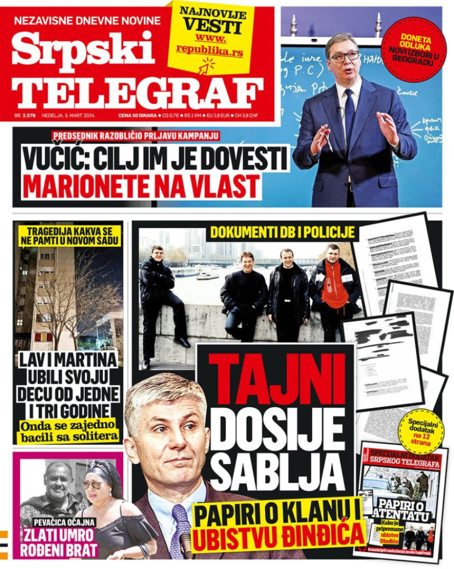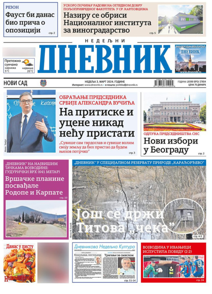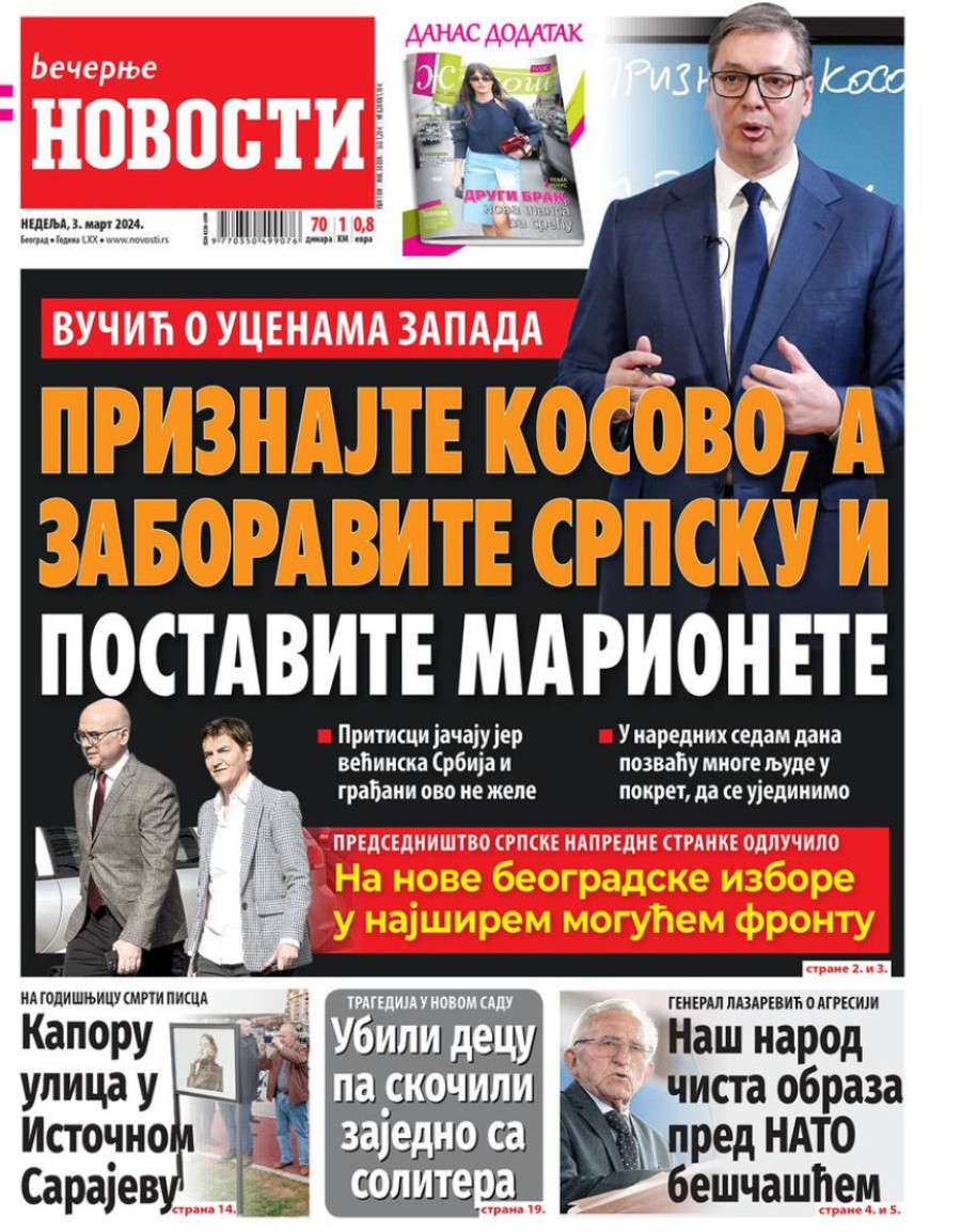Dnevne novine u Srbiji za nedelju 3. mart 2024. godine, na naslovnim stranama najavljuju brojne aktuelne društveno-političke teme.