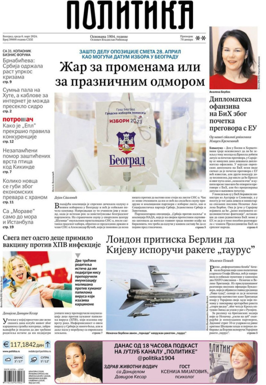 Dnevne novine u Srbiji za sredu 6. mart 2024. godine, na naslovnim stranama najavljuju brojne aktuelne društveno-političke teme.