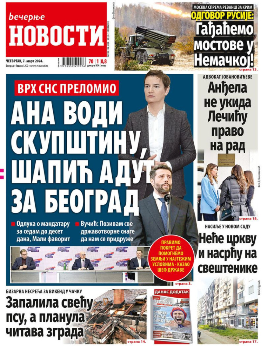 Dnevne novine u Srbiji za četvrtak 7. mart 2024. godine, na naslovnim stranama najavljuju brojne aktuelne društveno-političke teme.
