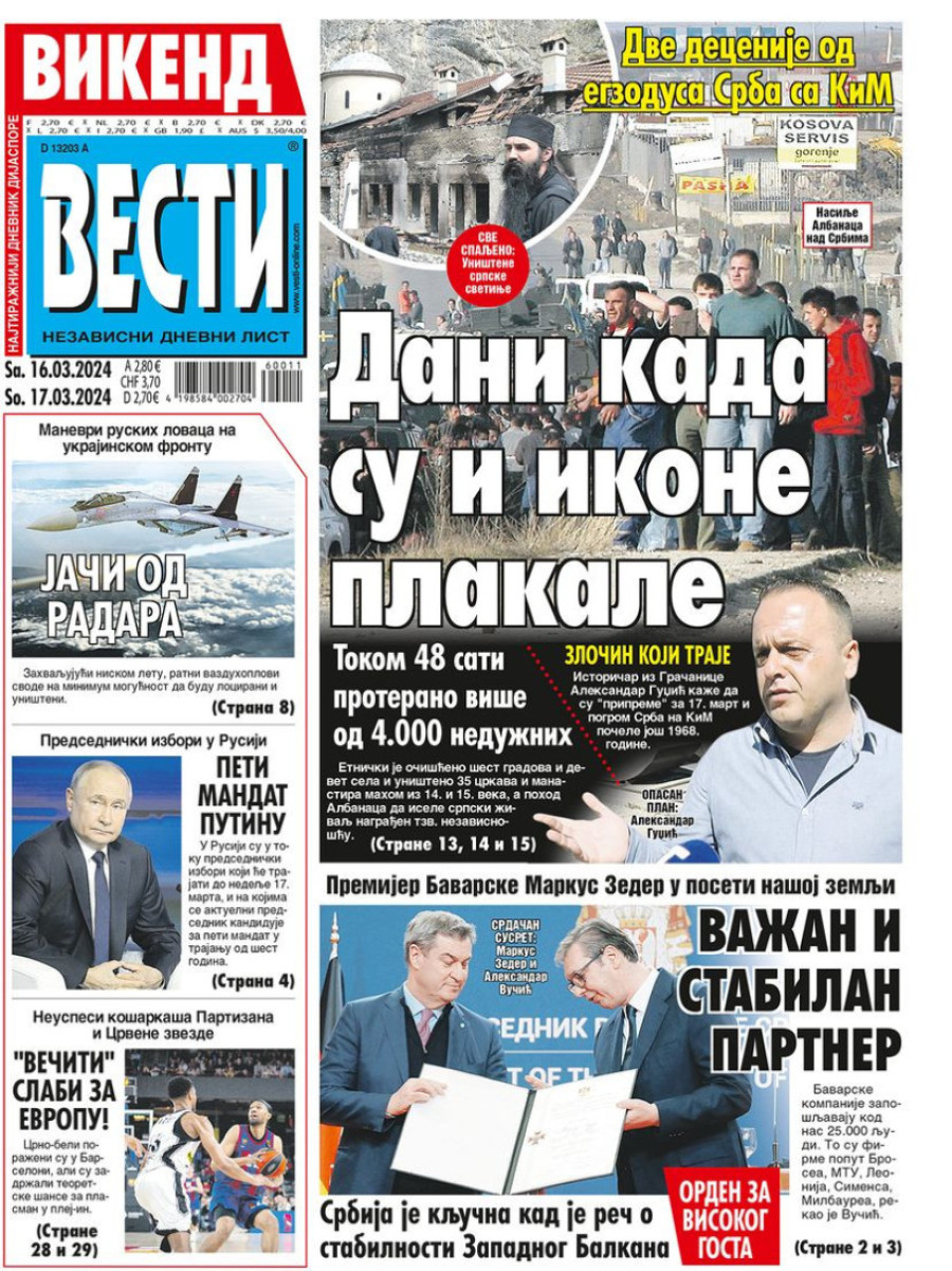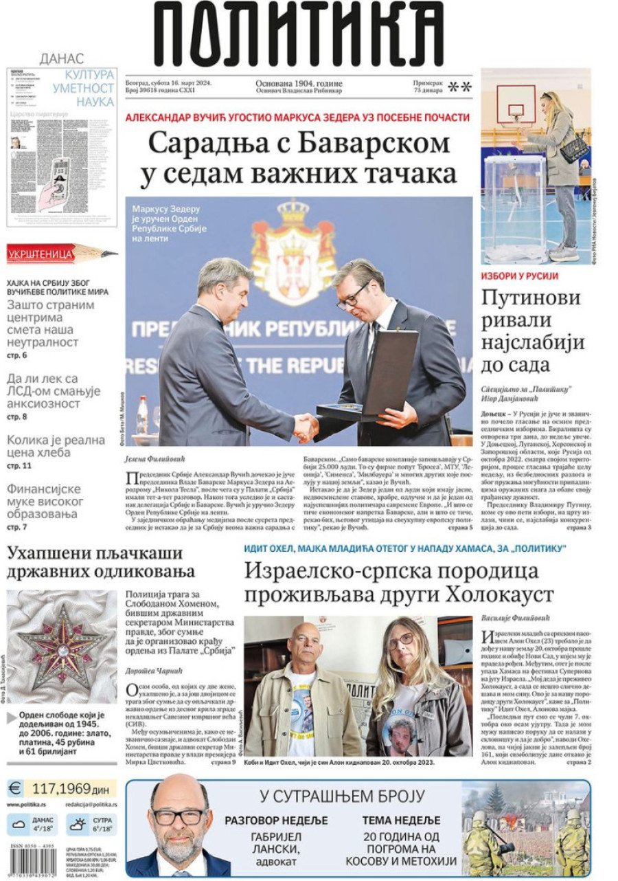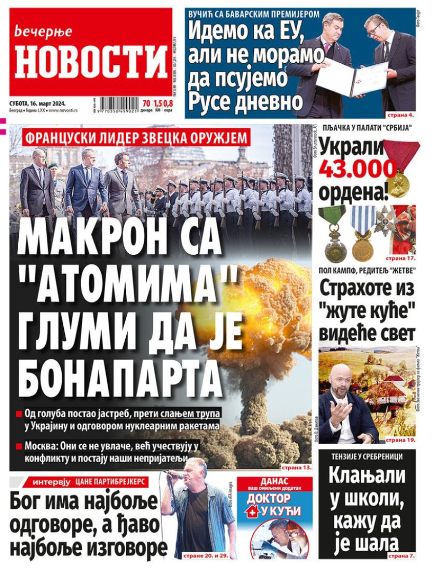 Dnevne novine u Srbiji za subotu 16. mart 2024. godine, na naslovnim stranama najavljuju brojne aktuelne društveno-političke teme.