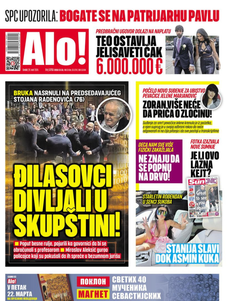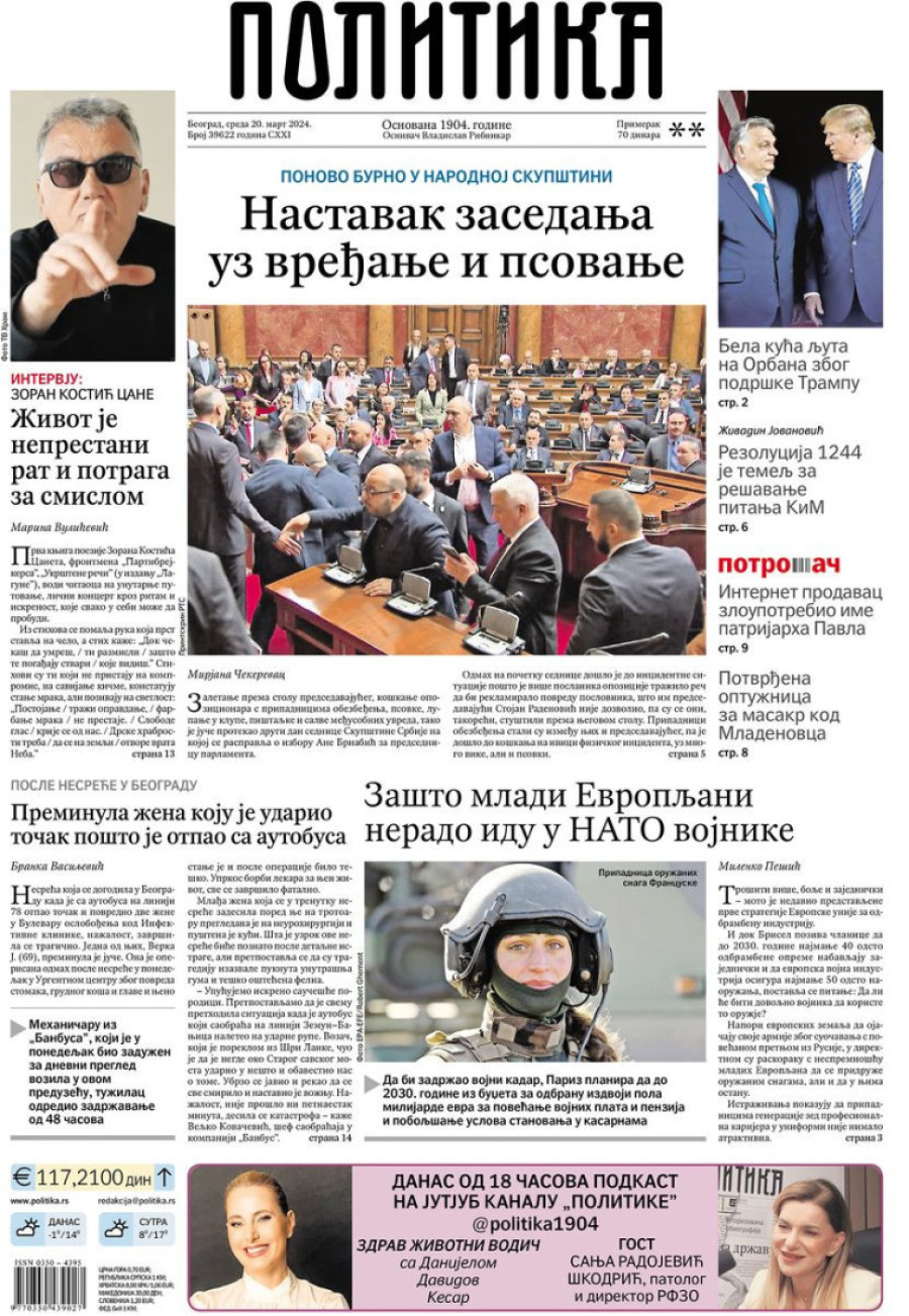 Dnevne novine u Srbiji za sredu 20. mart 2024. godine, na naslovnim stranama najavljuju brojne aktuelne društveno-političke teme.