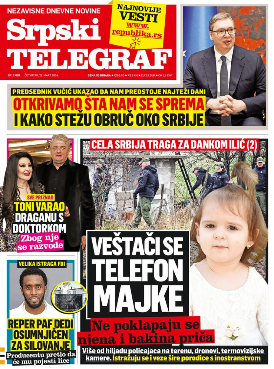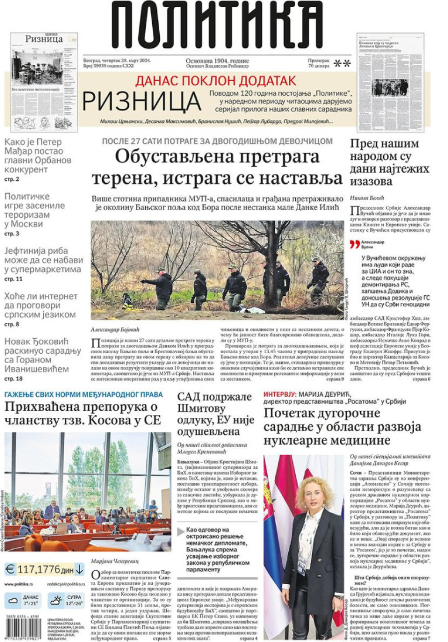 Dnevne novine u Srbiji za četvrtak 28. mart 2024. godine, na naslovnim stranama najavljuju brojne aktuelne društveno-političke teme.