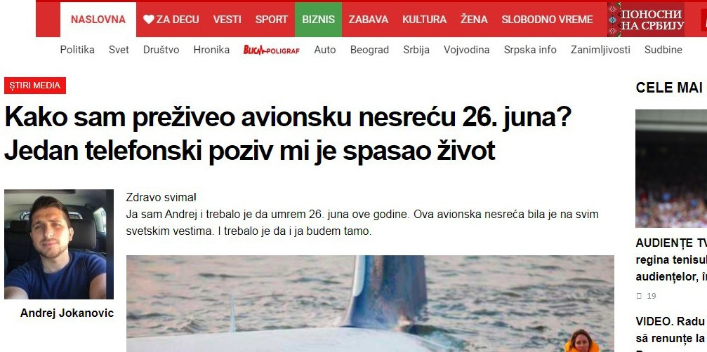 – Ja sam Andrej i trebalo je da umrem 26. juna ove godine. Ova avionska nesreća bila je na svim svetskim vestima. I trebalo je da i ja budem tamo – počinje ta ispovest, koja se nastavlja: