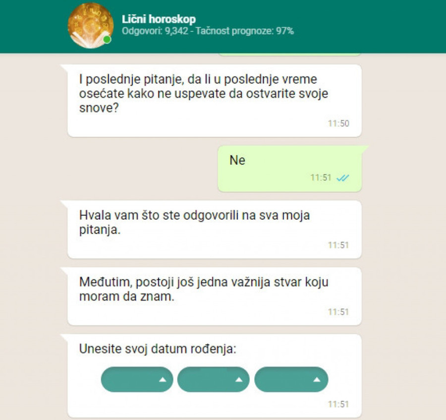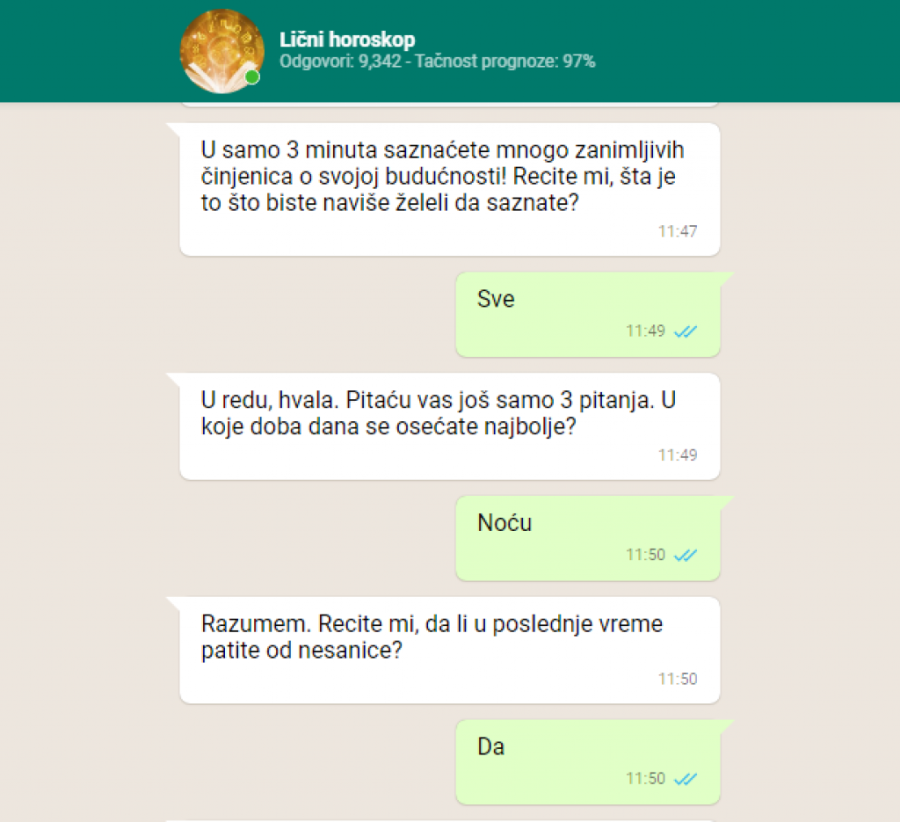 – Nakon što ga popunite, astrolog će vam poslati ličnu poruku, ako vam je pomoć potrebna. Ako niste u opasnosti, ona će vam samo poslati poruku da ćete živeti dugo i poželeće vam lep dan.