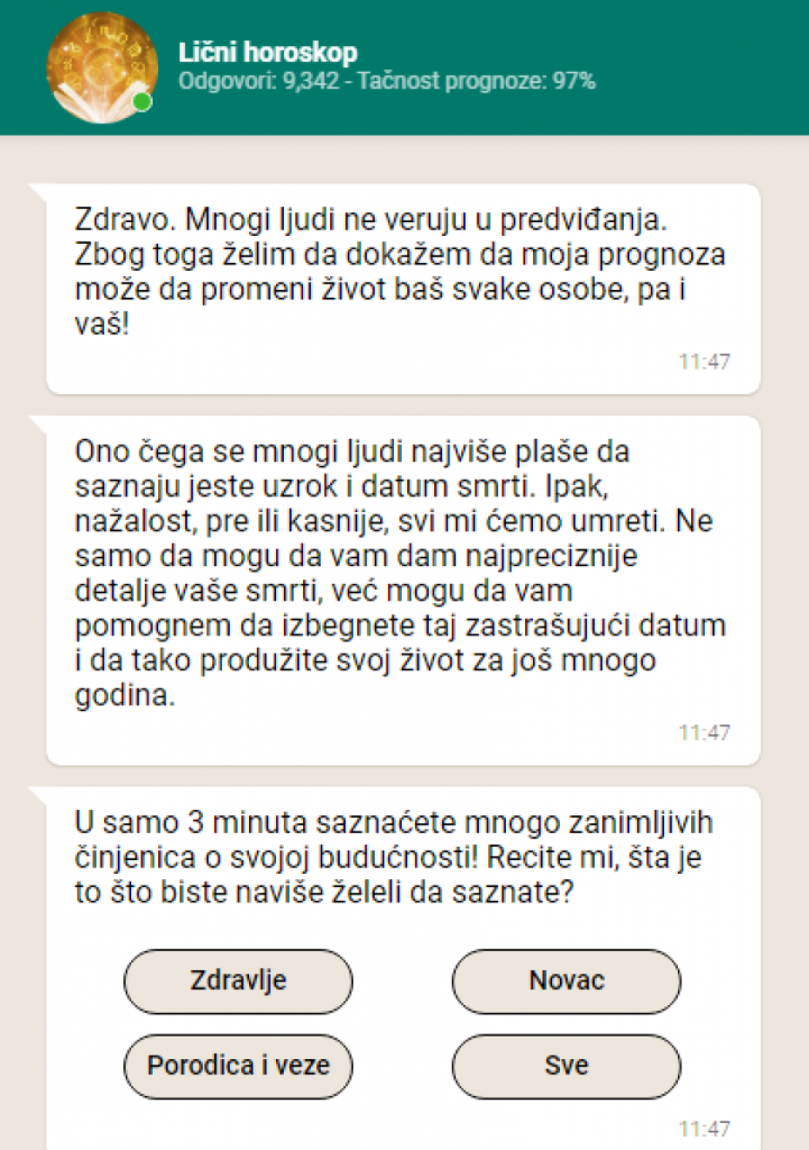 Sve je smišljeno da dođete do koraka sa kog je ili – ili, odnosno ili da pozovete i saslušate kada ćete da umrete, i to po ceni od 240 dinara za minut, ili da odustanete.