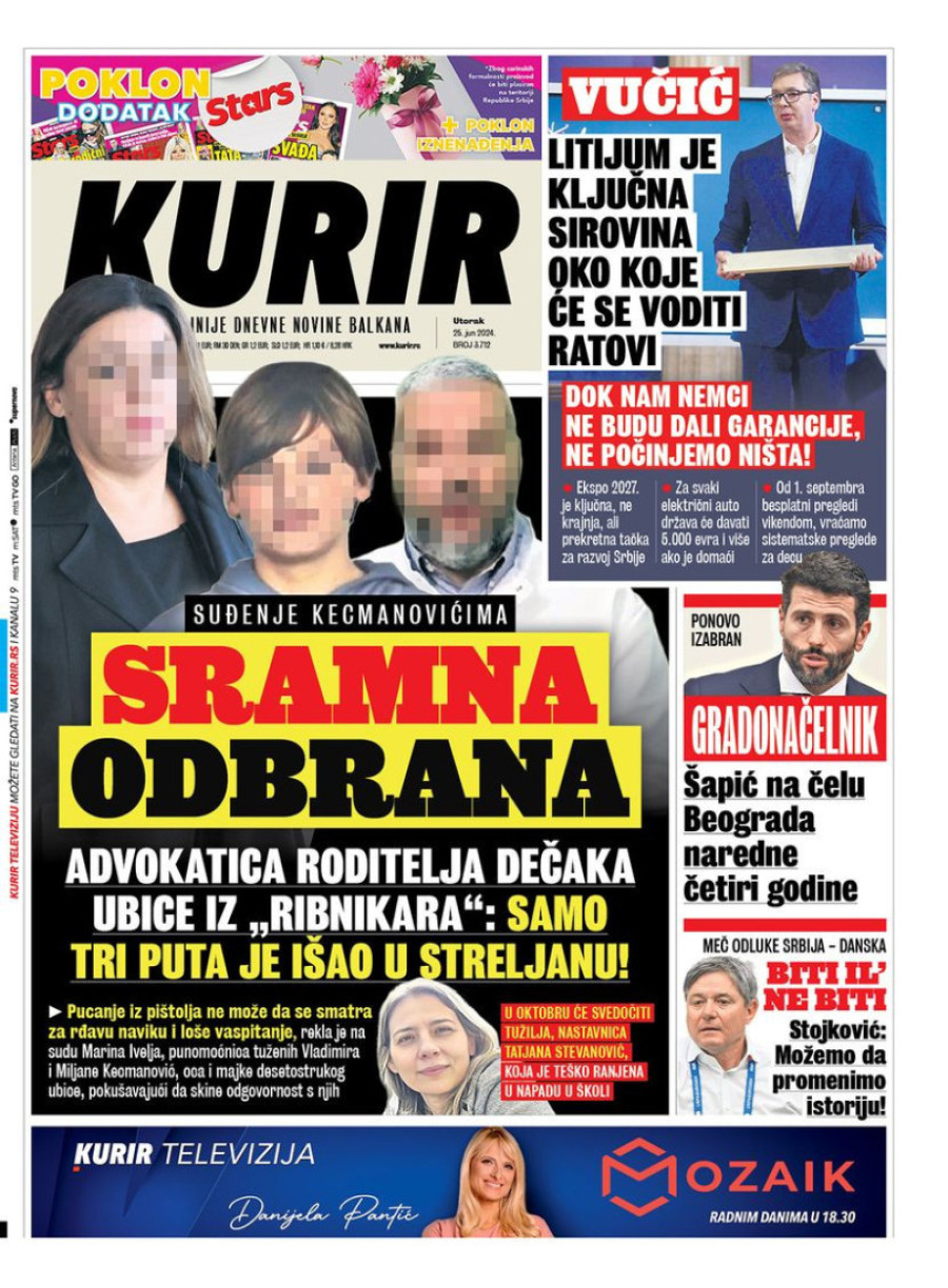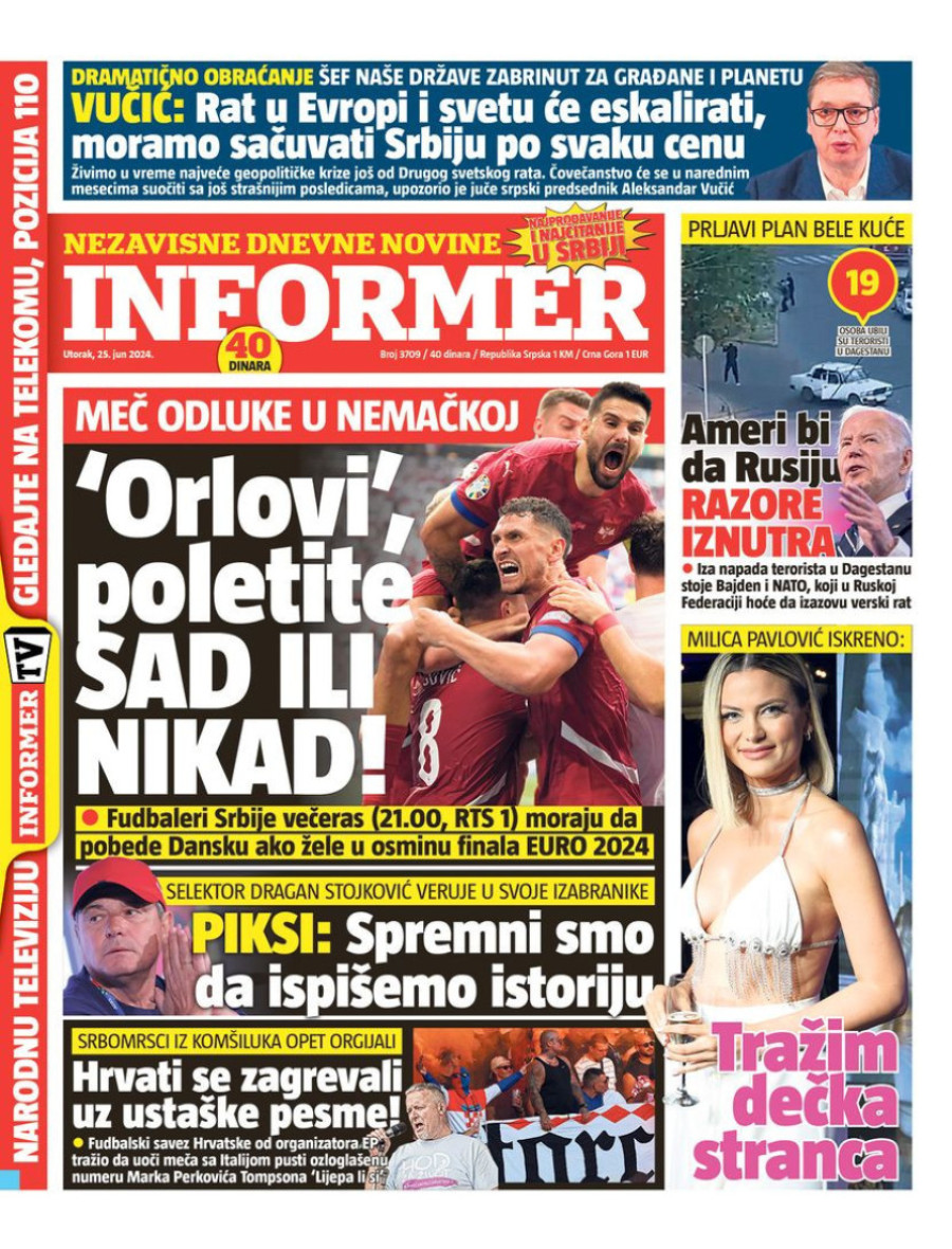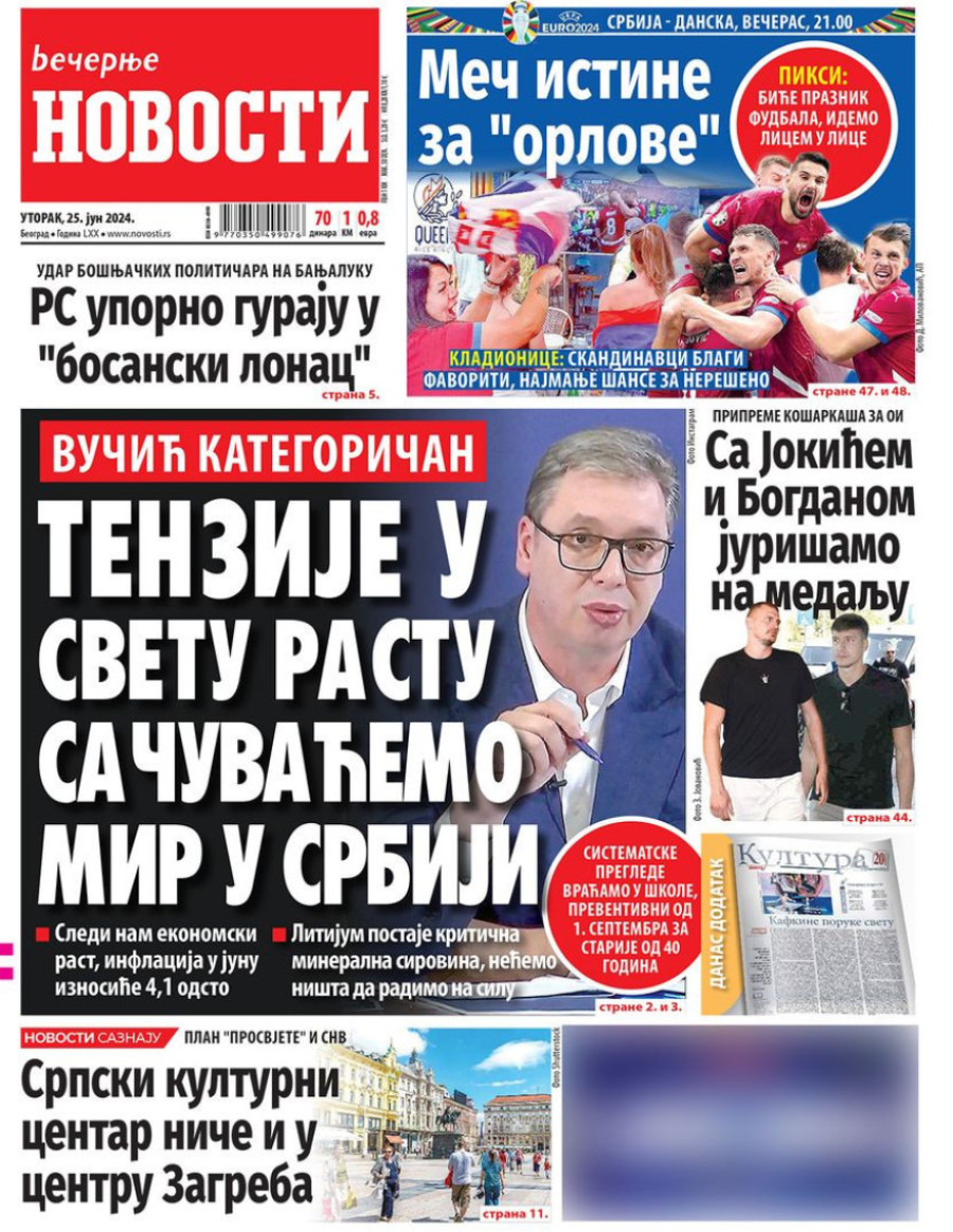 Dnevne novine u Srbiji za utorak 25. jun 2024. godine, na naslovnim stranama najavljuju brojne aktuelne društveno-političke teme.