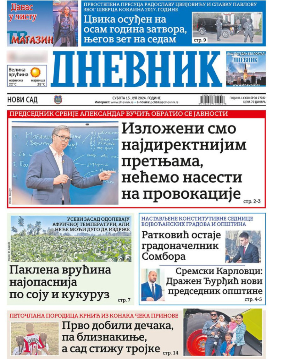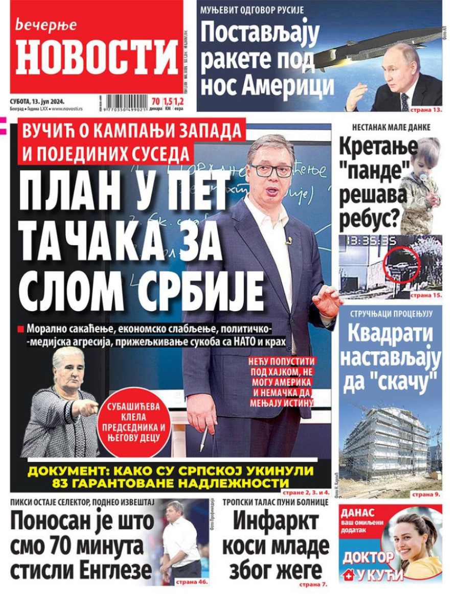 Dnevne novine u Srbiji za subotu 13. jul 2024. godine, na naslovnim stranama najavljuju brojne aktuelne društveno-političke teme.