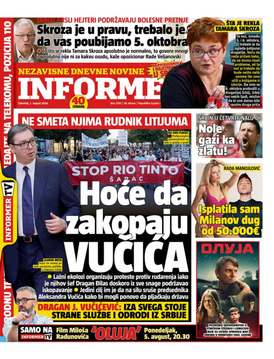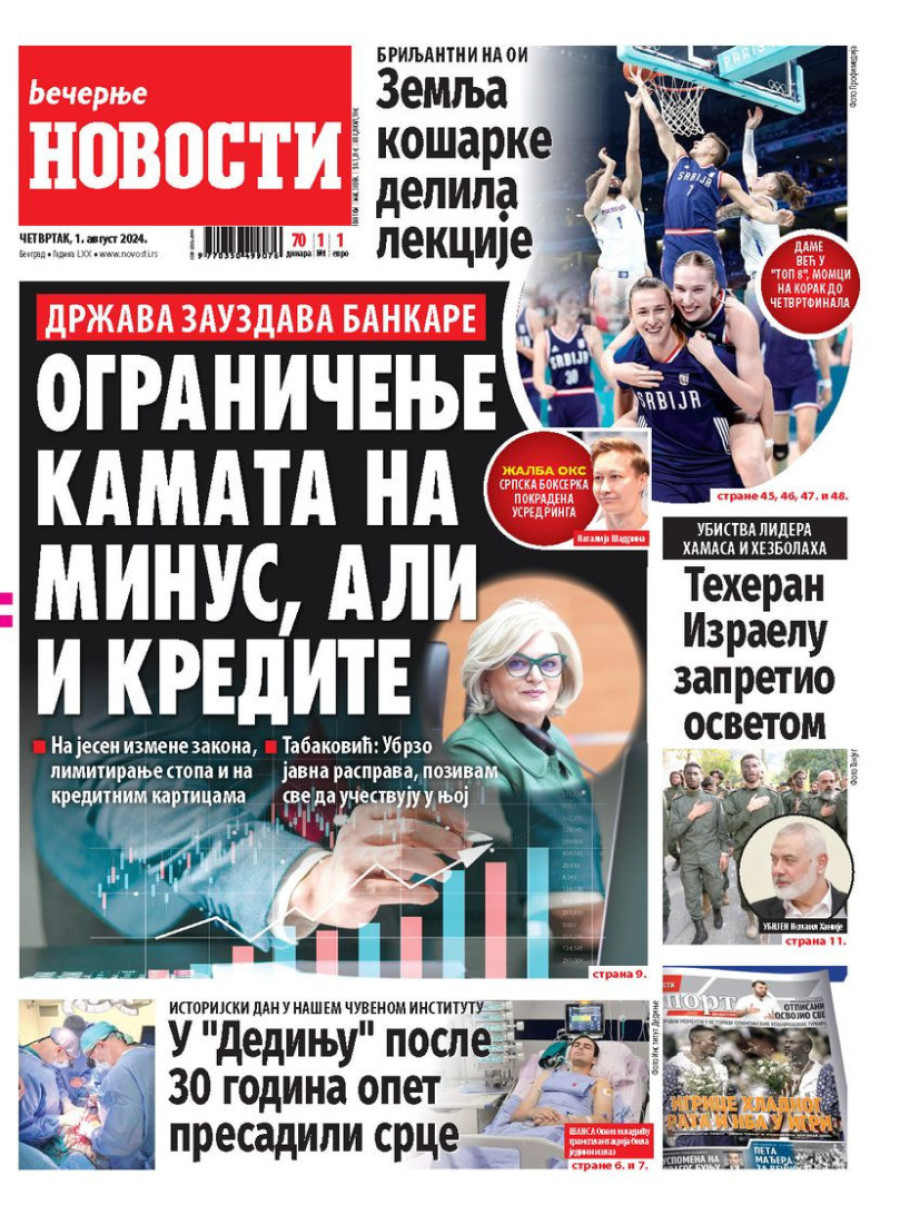 Dnevne novine u Srbiji za četvrtak 1. avgust 2024. godine, na naslovnim stranama najavljuju brojne aktuelne društveno-političke teme.