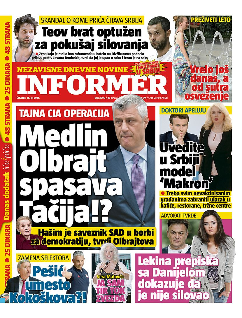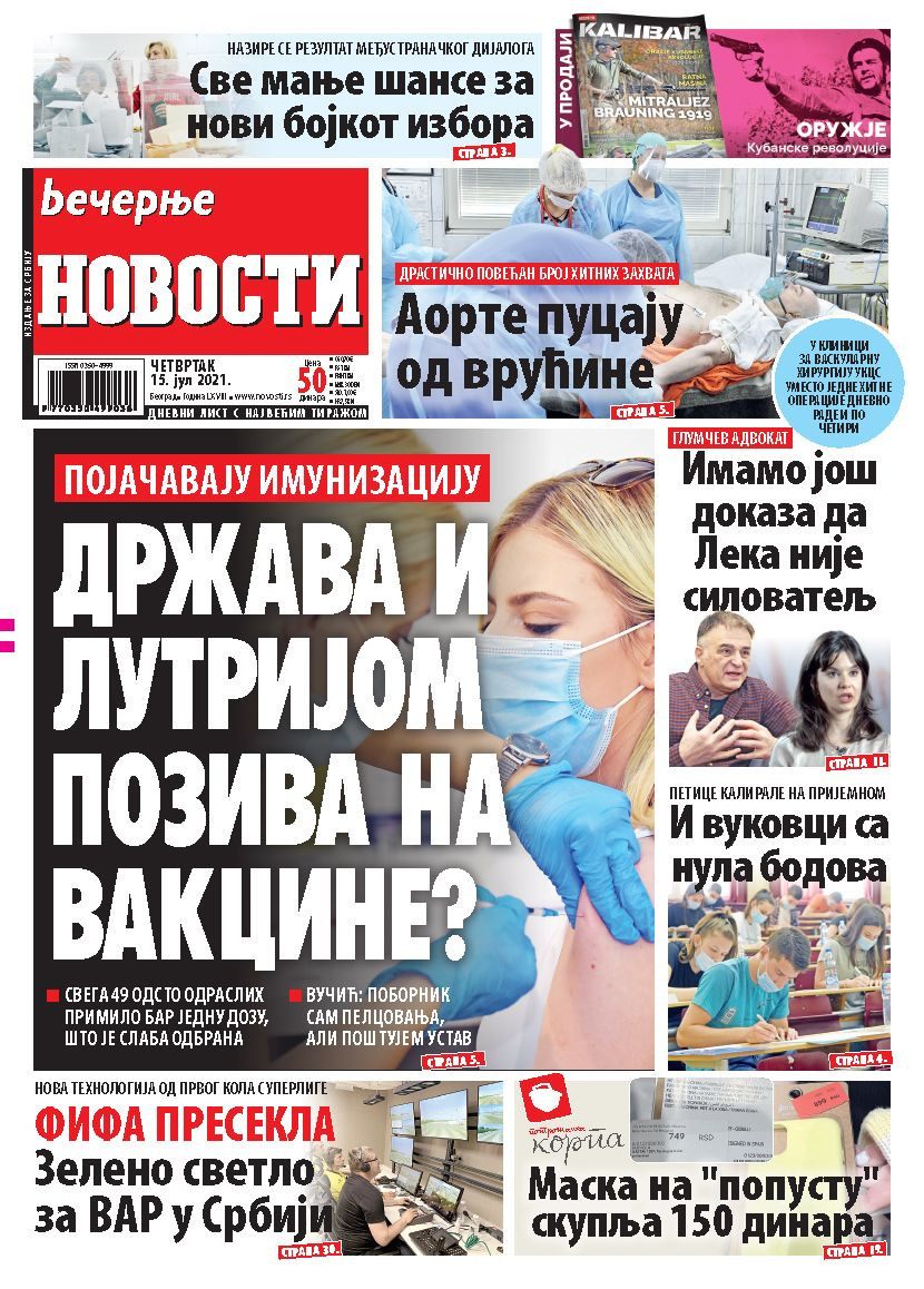 Dnevne novine u Srbiji za četvrtak, 15. jul 2021. godine, na naslovnim stranama najavljuju brojne aktuelne društveno-političke teme i donose ekskluzivne priče.