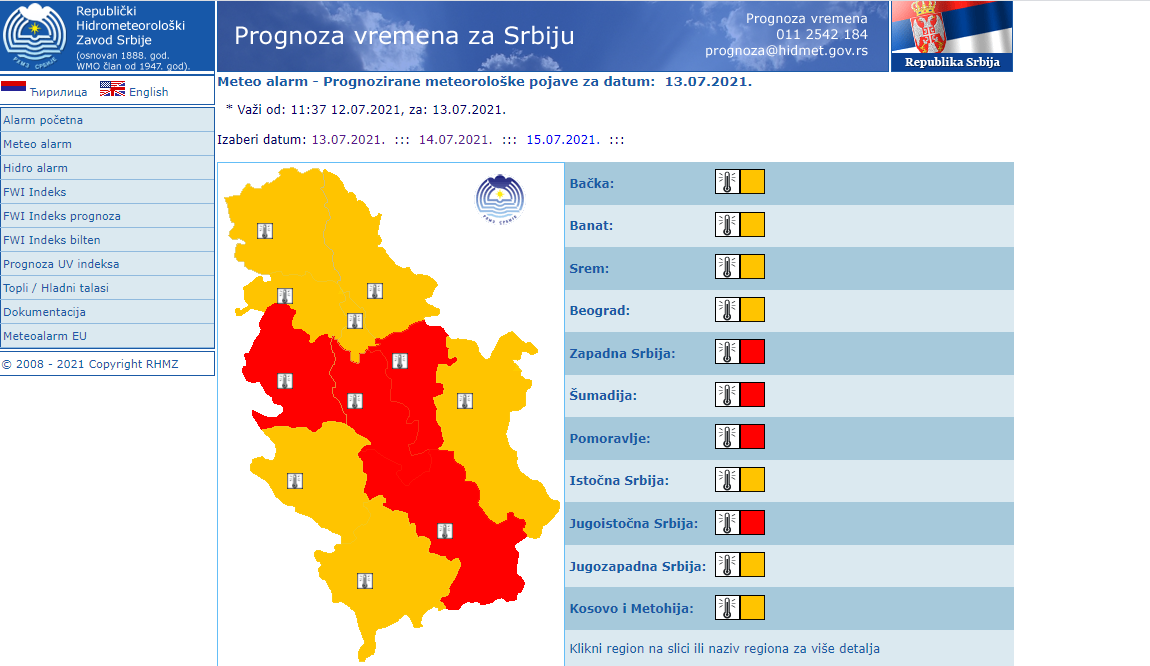 Crveni meteoalarm “upaljen” je u Zapadnoj Srbiji, Šumadiji, Pomoravlju u Jugoistočnoj Srbiji, dok je ostatak zemlje u “narandžastoj zoni”. I jedna i druga boja ukazuju da je vreme opasno.
