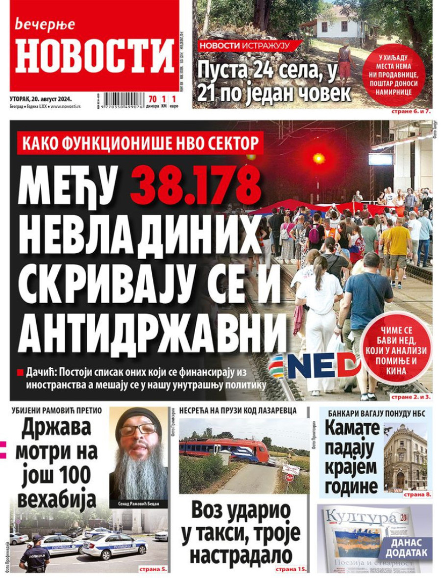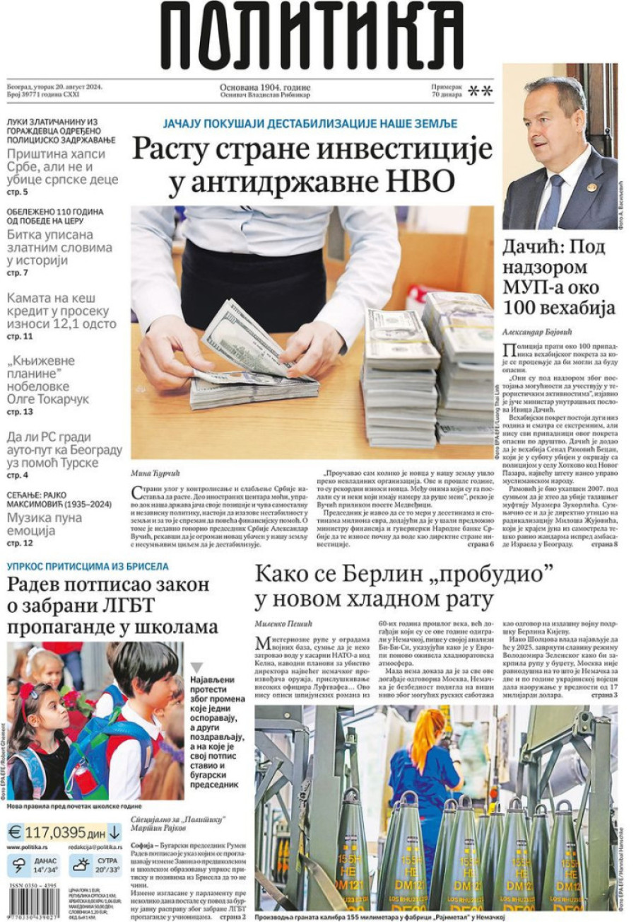 Dnevne novine u Srbiji za utorak 20. avgust 2024. godine, na naslovnim stranama najavljuju brojne aktuelne društveno-političke teme.
