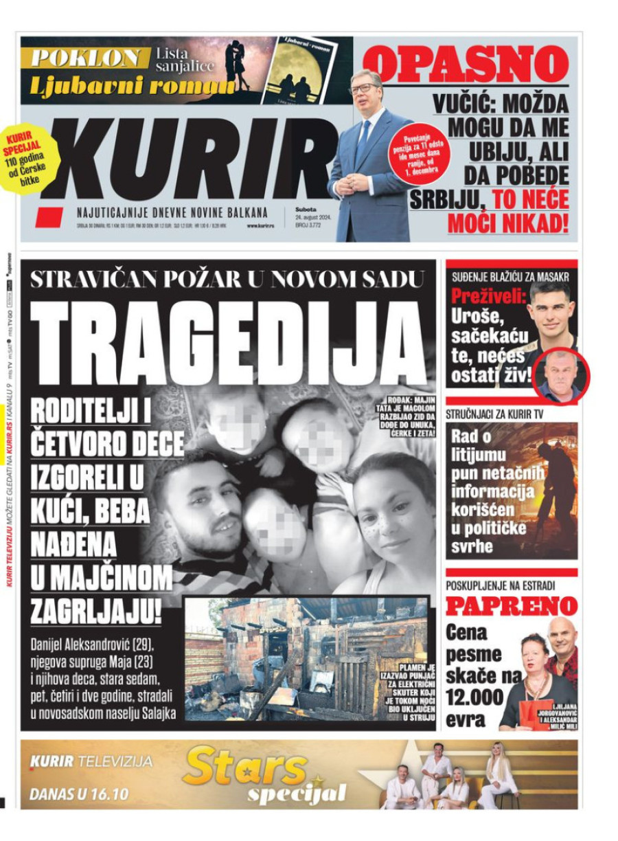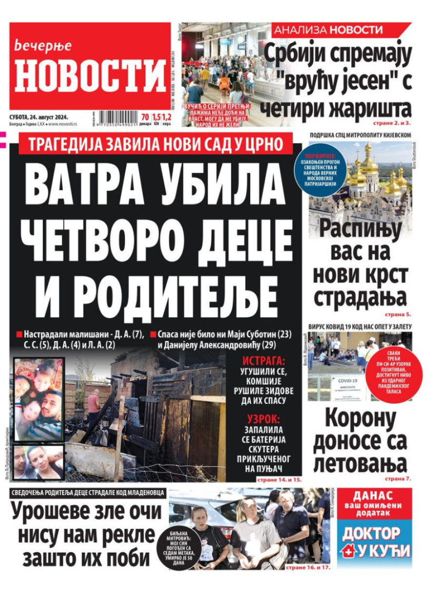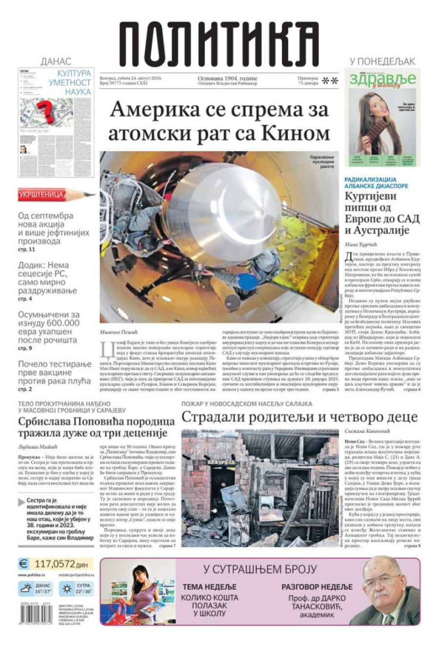 Dnevne novine u Srbiji za subotu 24. avgust 2024. godine, na naslovnim stranama najavljuju brojne aktuelne društveno-političke teme.