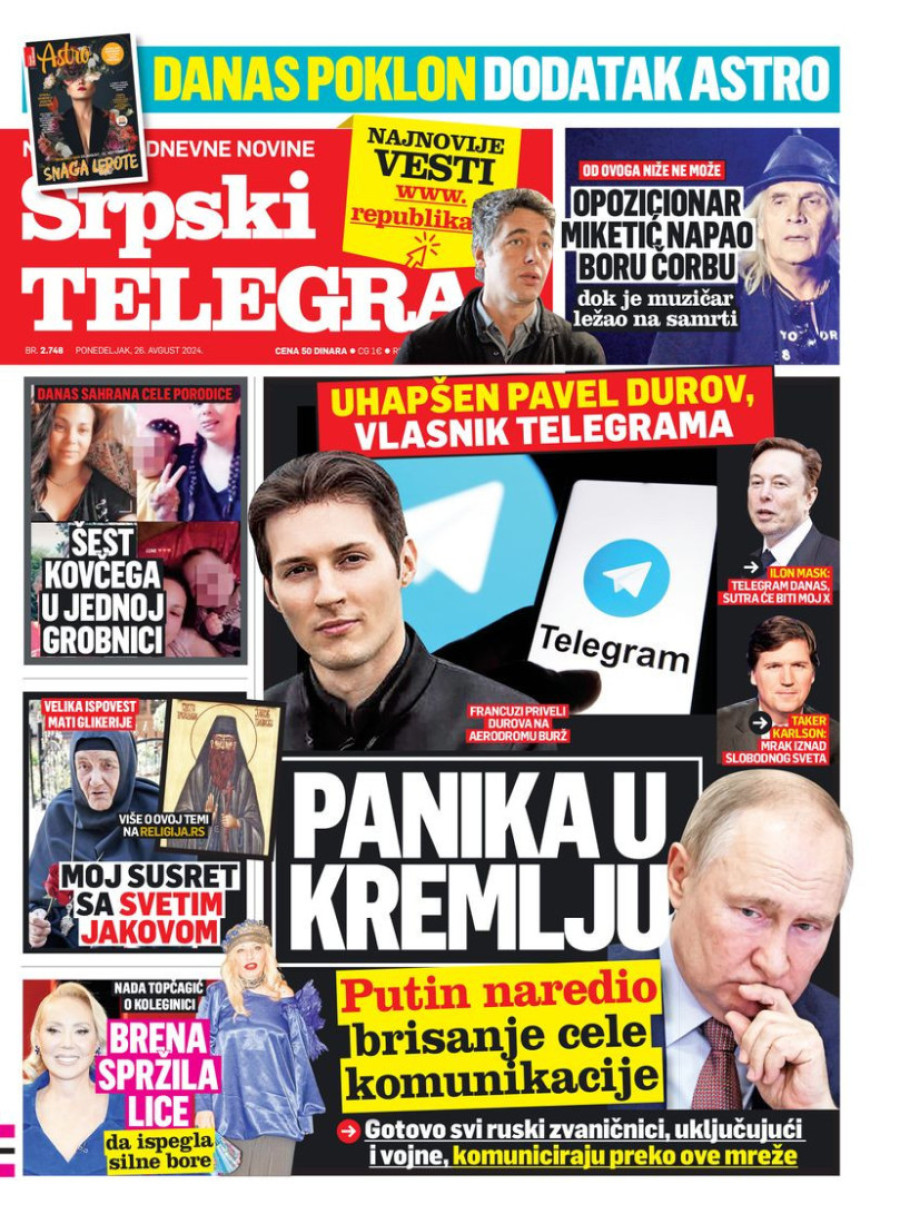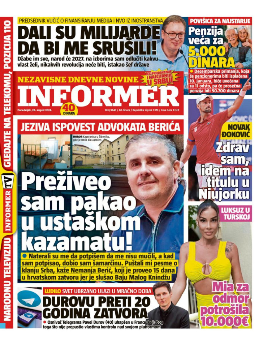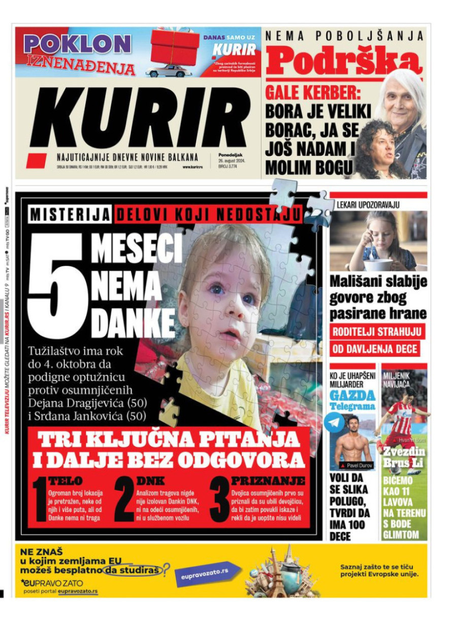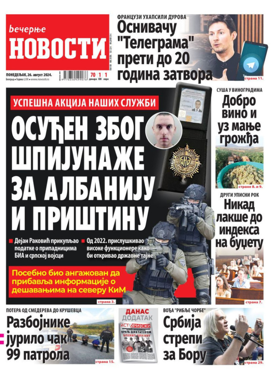 Dnevne novine u Srbiji za ponedeljak 26. avgust 2024. godine, na naslovnim stranama najavljuju brojne aktuelne društveno-političke teme.