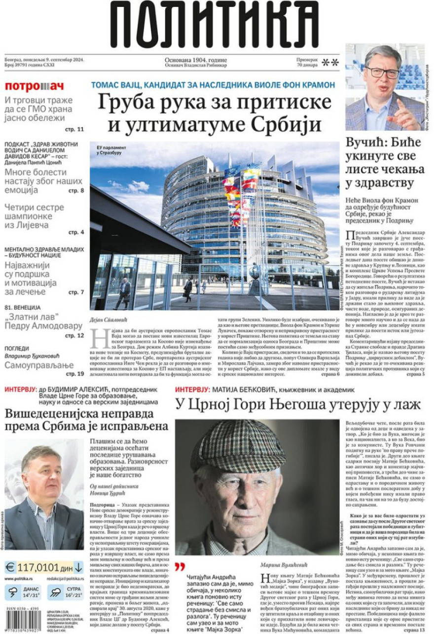 Dnevne novine u Srbiji za ponedeljak 9. septembar 2024. godine, na naslovnim stranama najavljuju brojne aktuelne društveno-političke teme.
