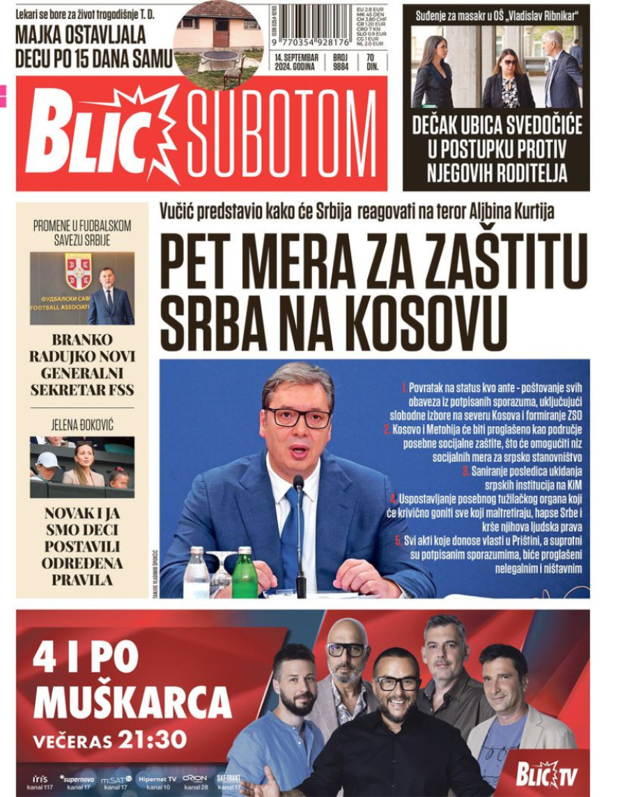 Dnevne novine u Srbiji za subotu 14. septembar 2024. godine, na naslovnim stranama najavljuju brojne aktuelne društveno-političke teme.
