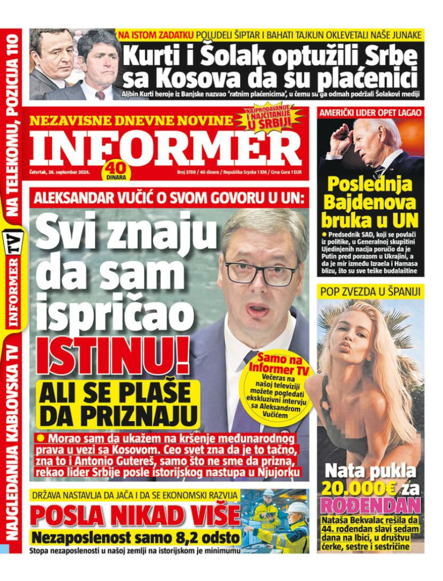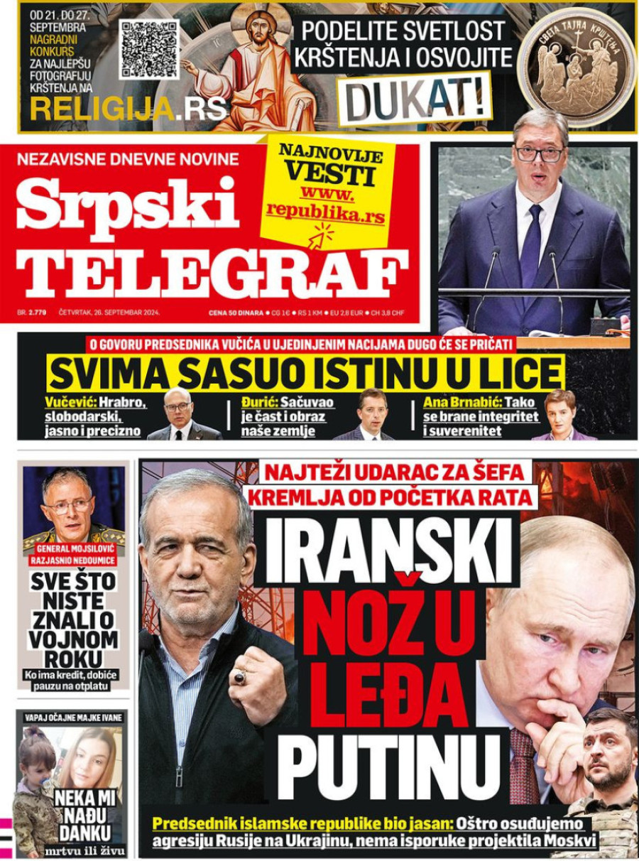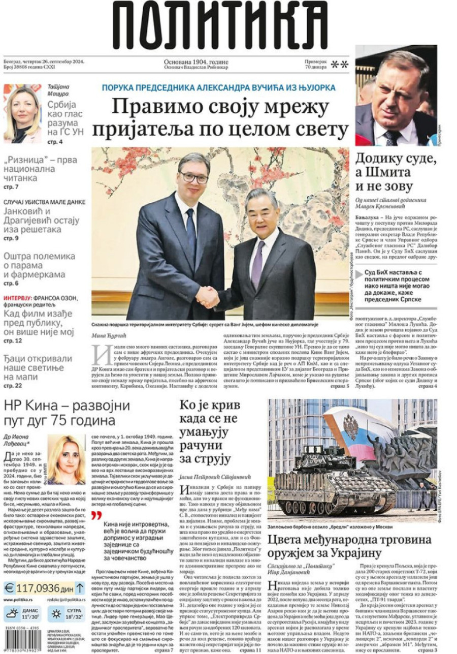 Naslovne strane dnevnih novina: Prelistavanje štampe za 26. septembar 2024. godine