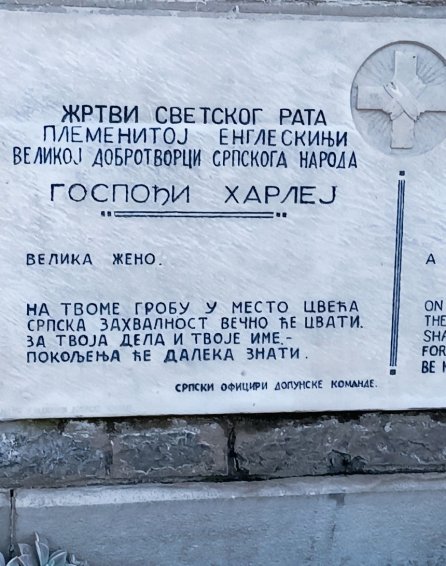 Žrtvi svetskog rata, plemenitoj Engleskinji, velikoj dobrotvorci srpskog naroda.