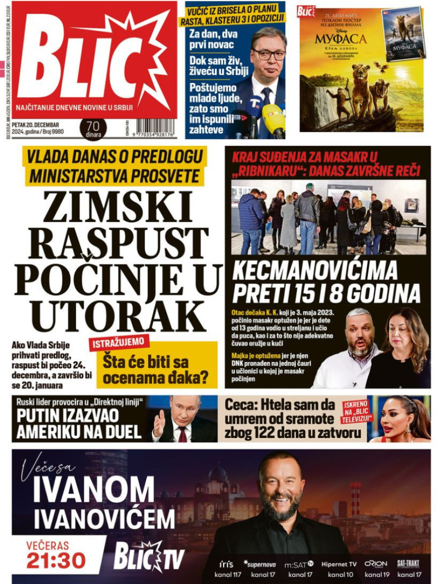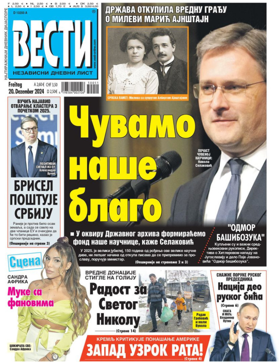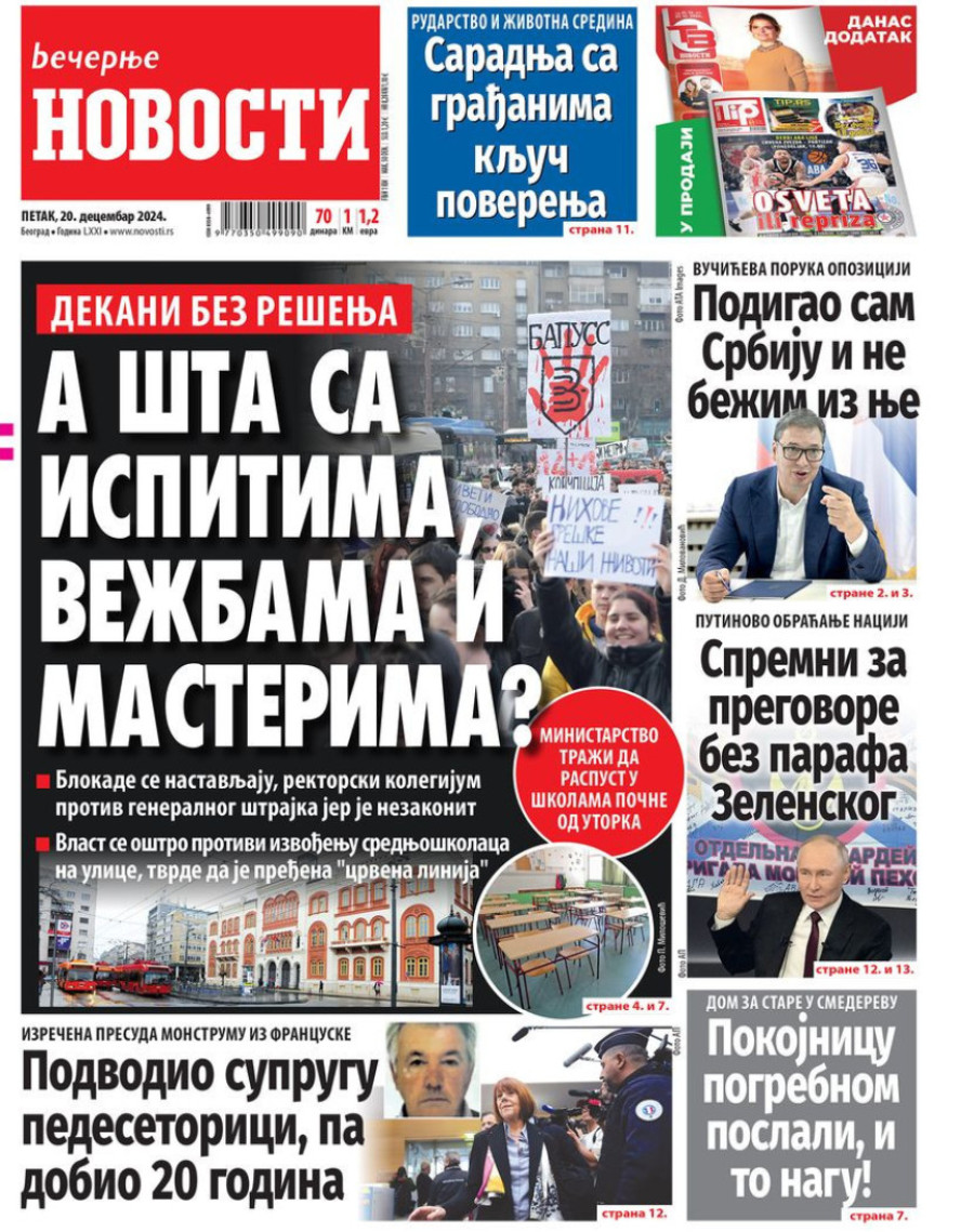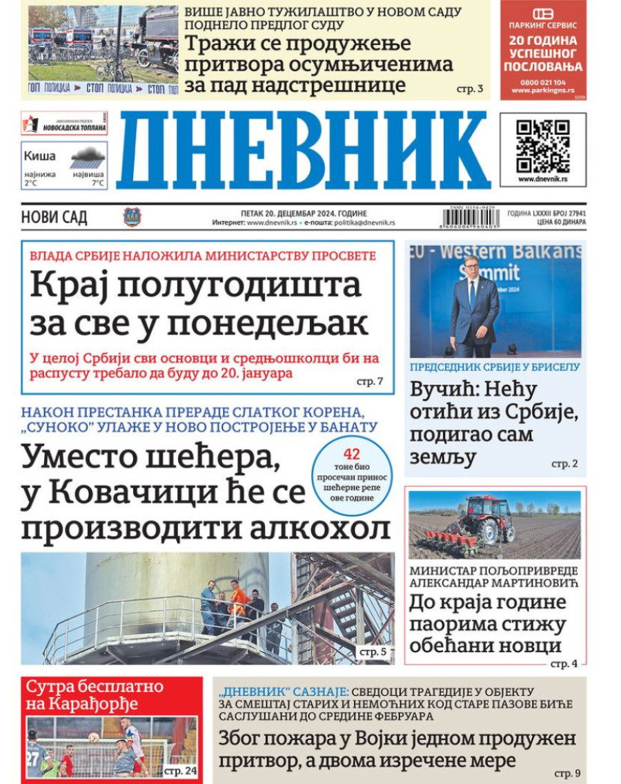 Naslovne strane dnevnih novina: Prelistavanje štampe za 20. decembar 2024. godine