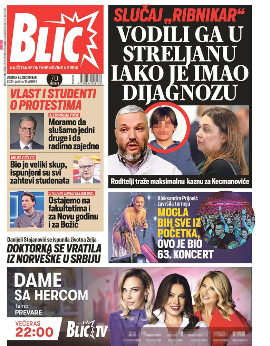 Dnevne novine u Srbiji za utorak 24. decembar na naslovnim stranama najavljuju brojne aktuelne društveno-političke teme.