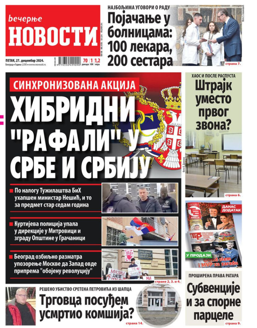 Dnevne novine u Srbiji za petak 27. decembar 2024. godine na naslovnim stranama najavljuju brojne aktuelne društveno-političke teme.