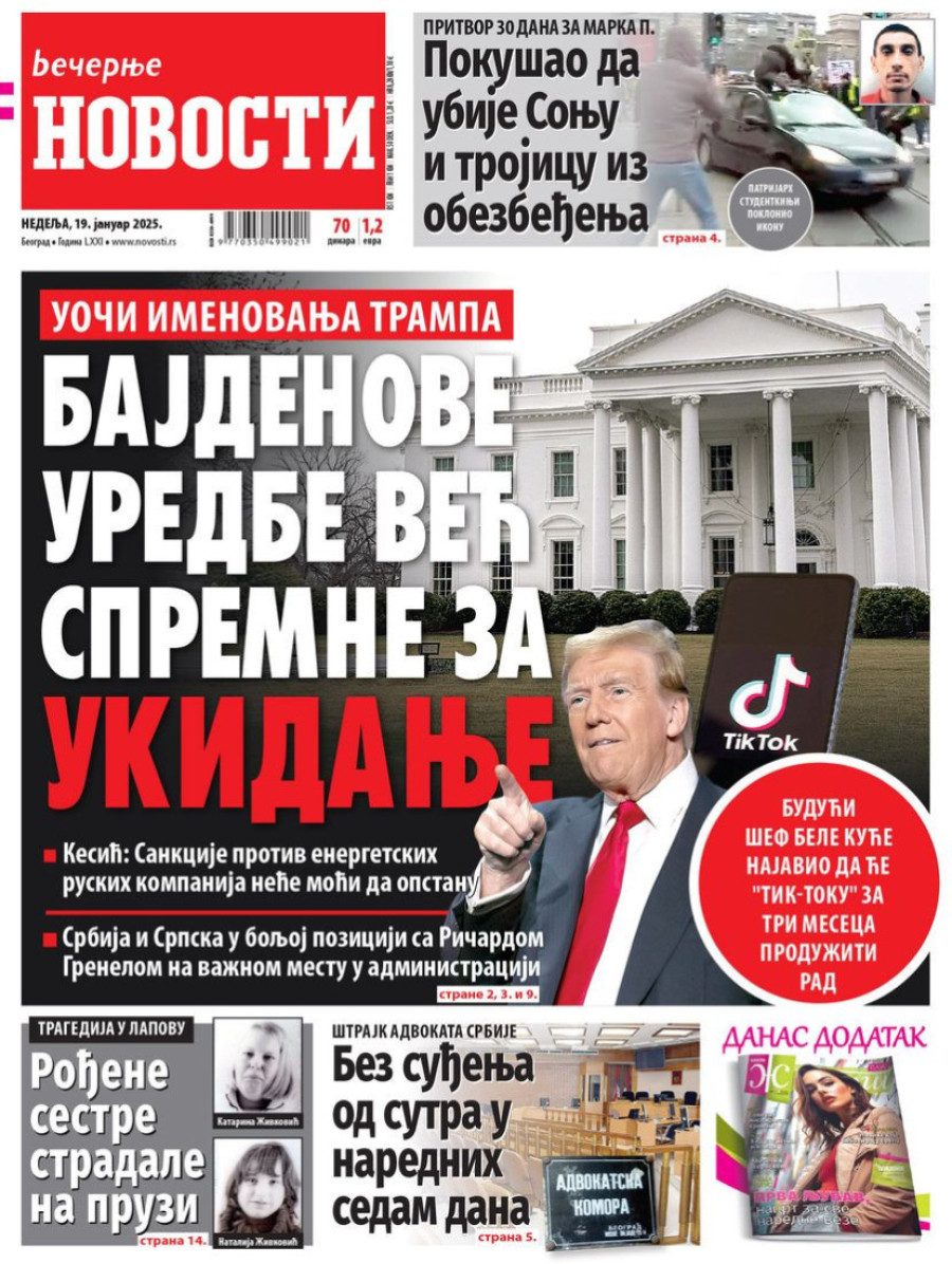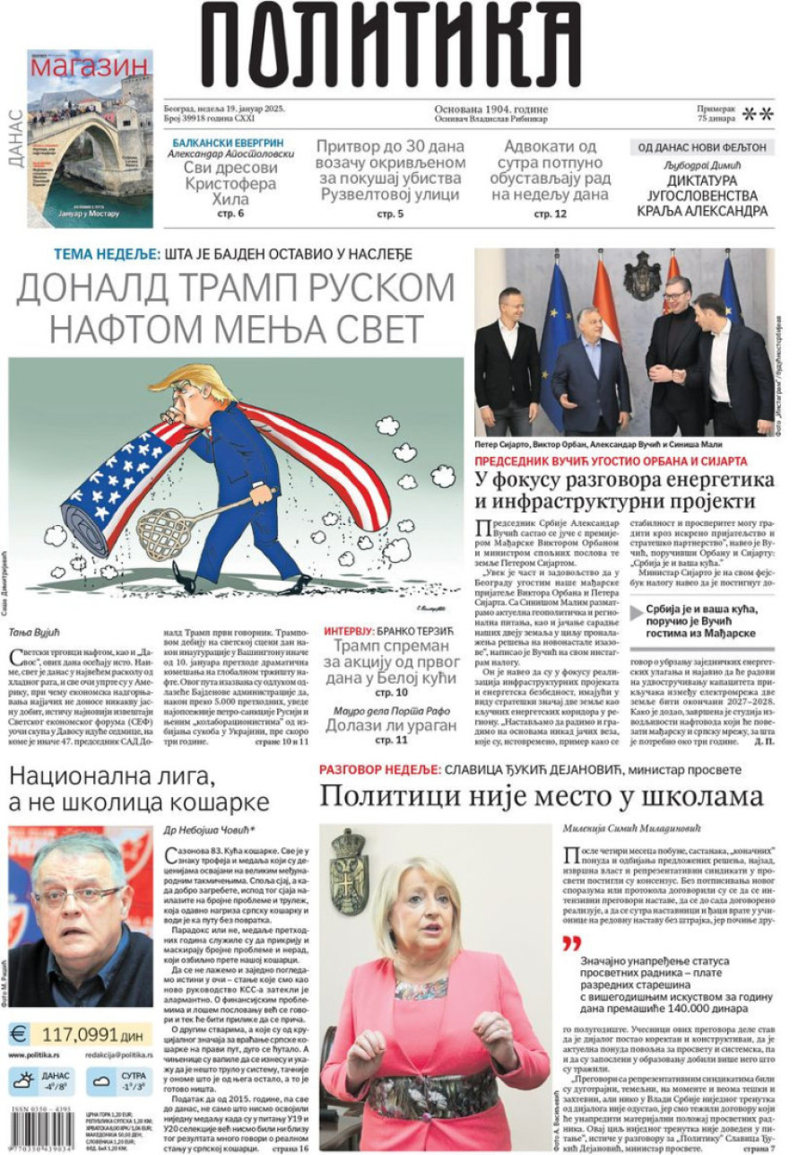Naslovne strane dnevnih novina: Prelistavanje štampe za 19. januar 2025. godine