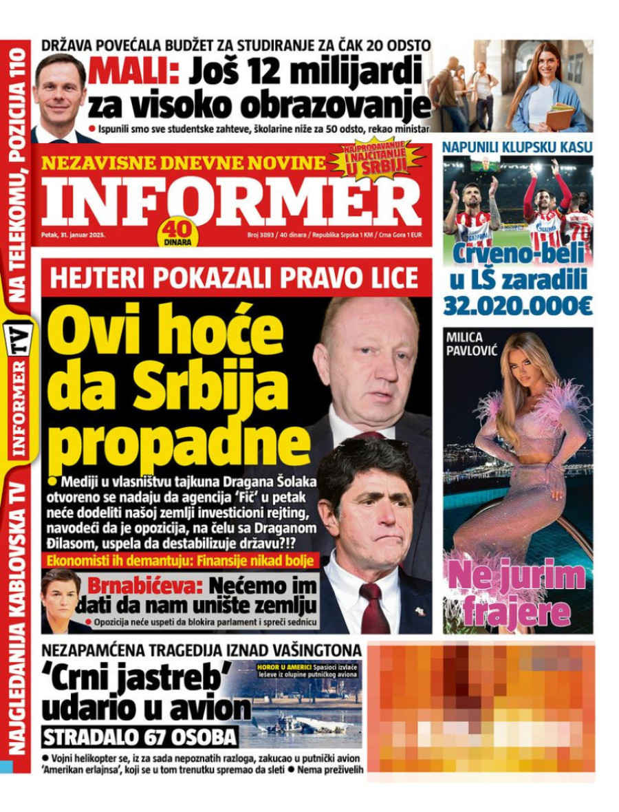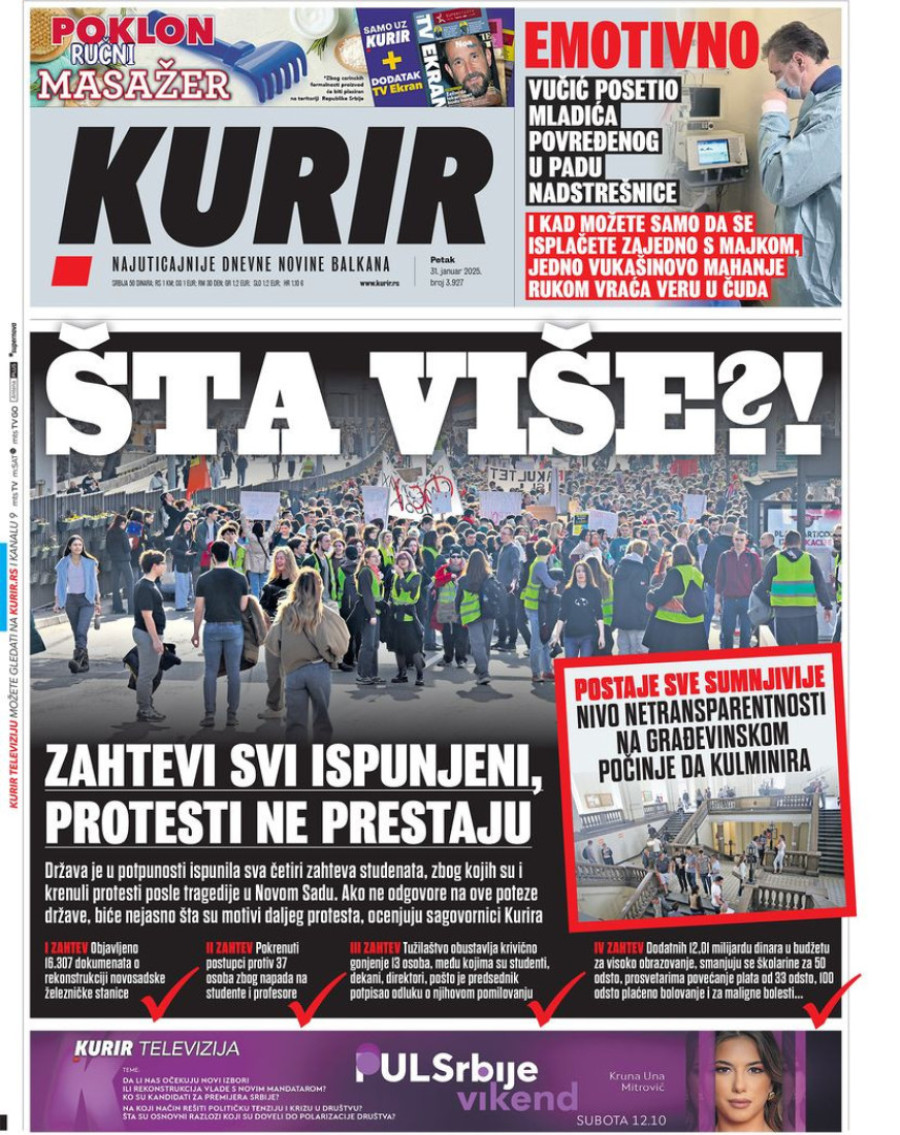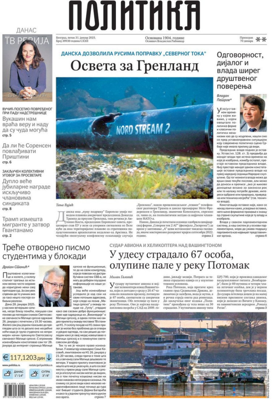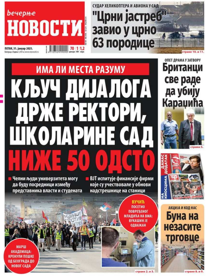 Dnevne novine u Srbiji za petak 31. januar 2025. godine na naslovnim stranama najavljuju brojne aktuelne društveno-političke teme.