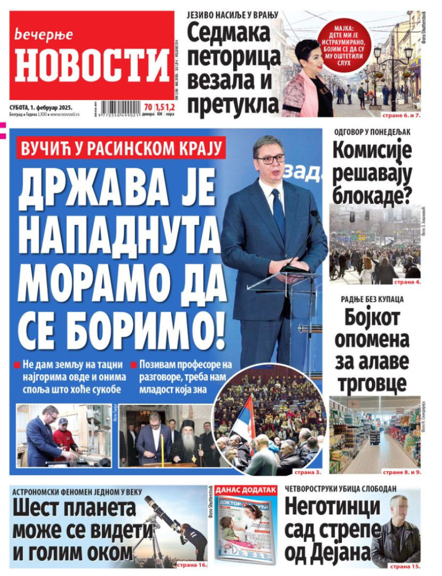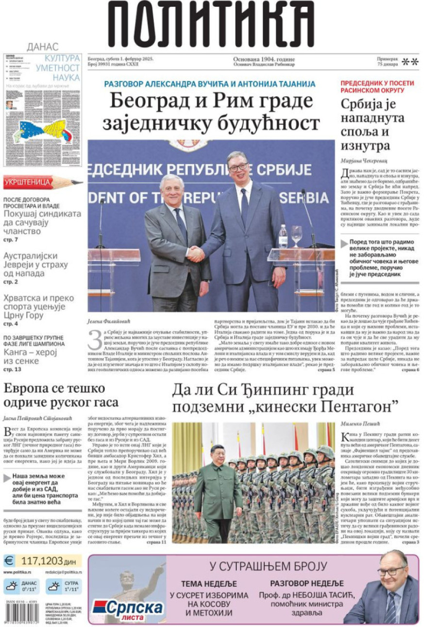 Dnevne novine u Srbiji za subotu 1. februar 2025. godine na naslovnim stranama najavljuju brojne aktuelne društveno-političke teme.