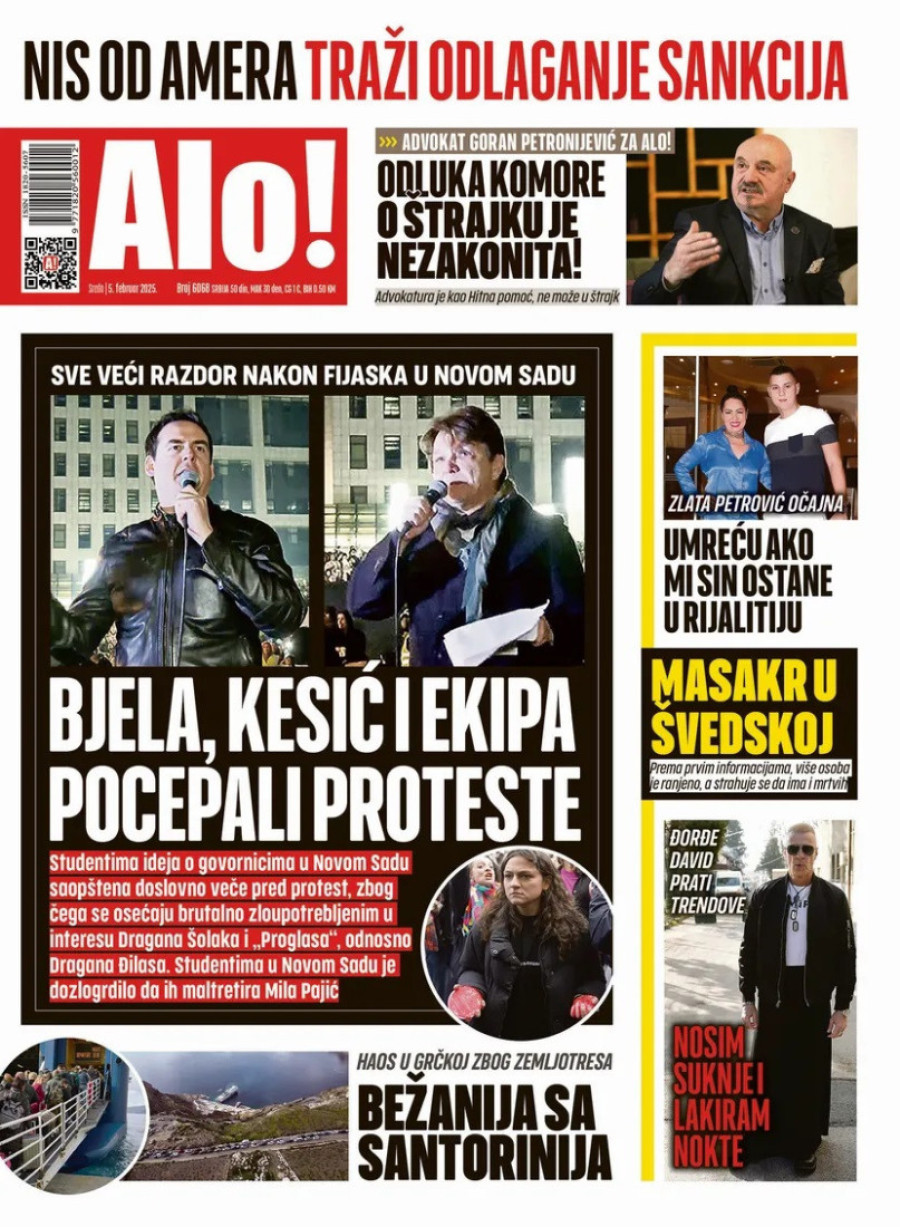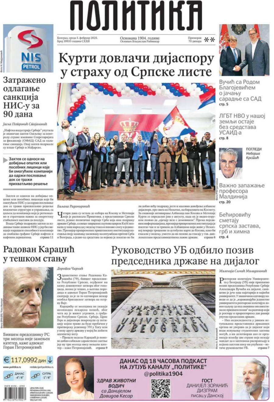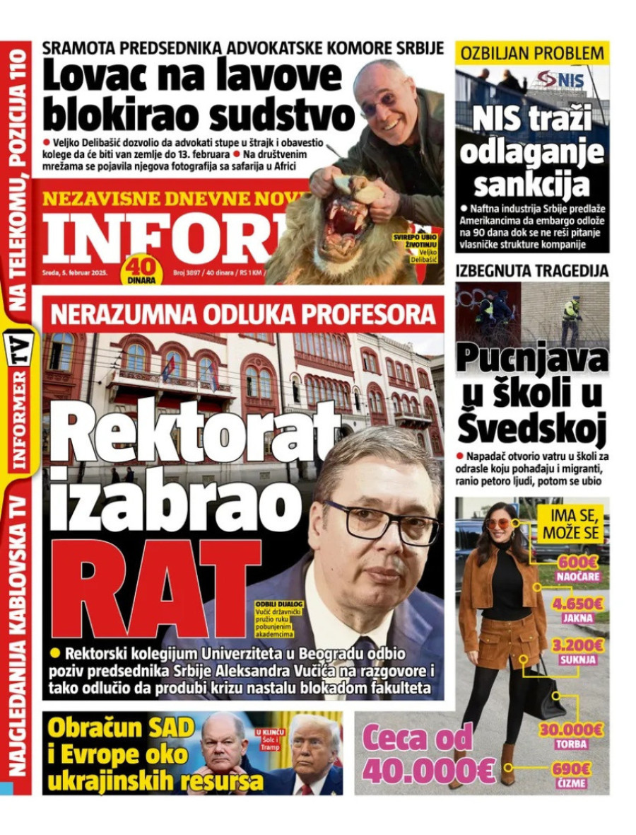 Dnevne novine u Srbiji za sredu 5. februar 2025. godine na naslovnim stranama najavljuju brojne aktuelne društveno-političke teme.