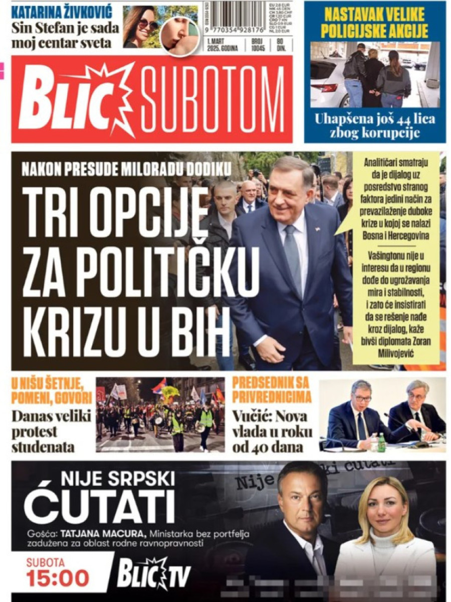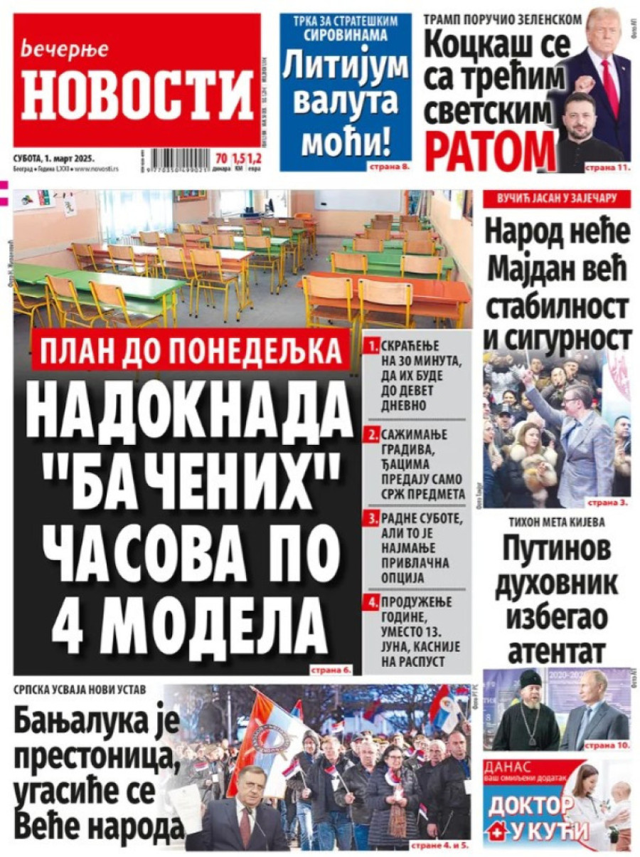 Dnevne novine u Srbiji za subotu 1. mart 2025. godine na naslovnim stranama najavljuju brojne aktuelne društveno-političke teme.