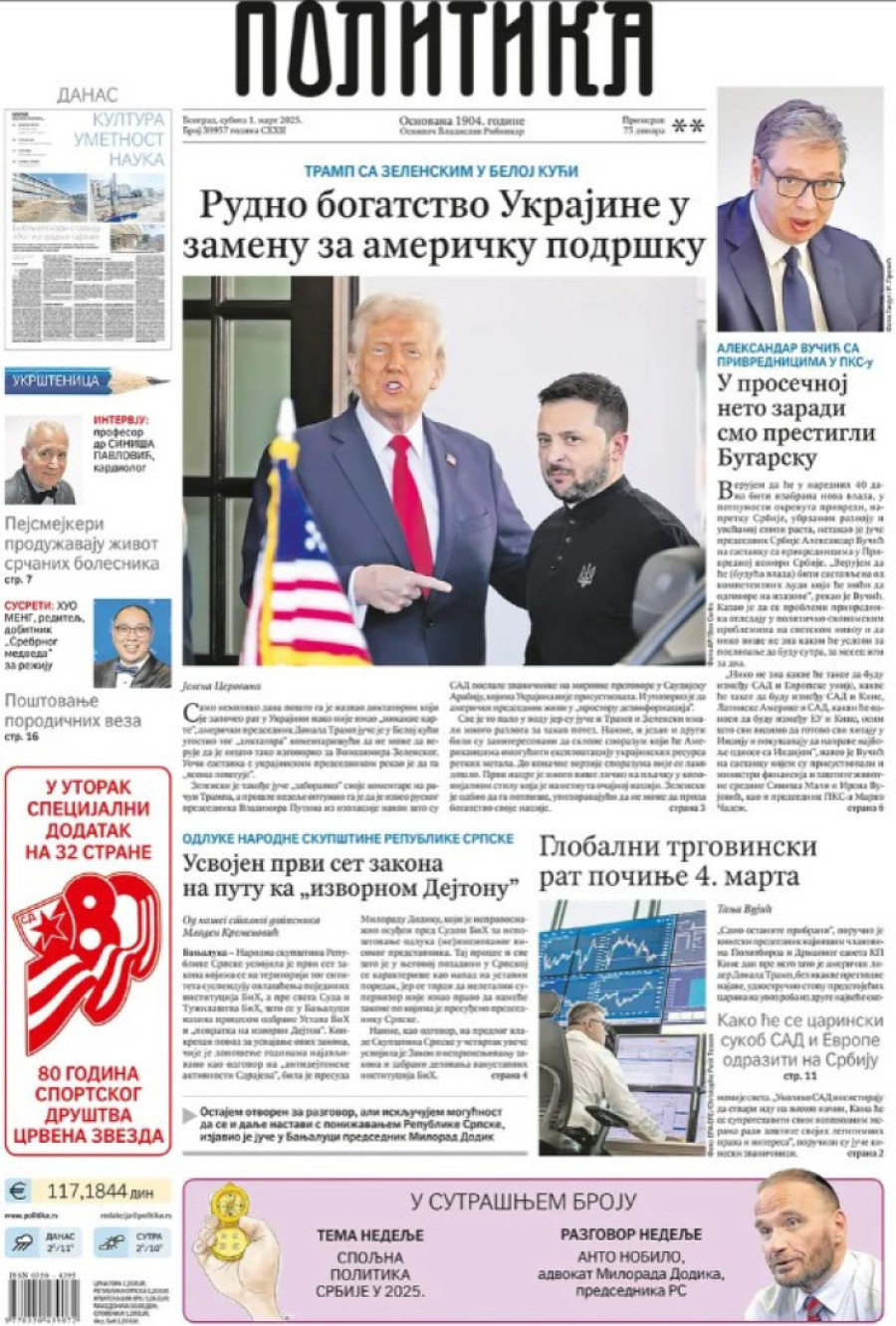 Naslovne strane dnevnih novina: Prelistavanje štampe za 1. mart 2025. godine