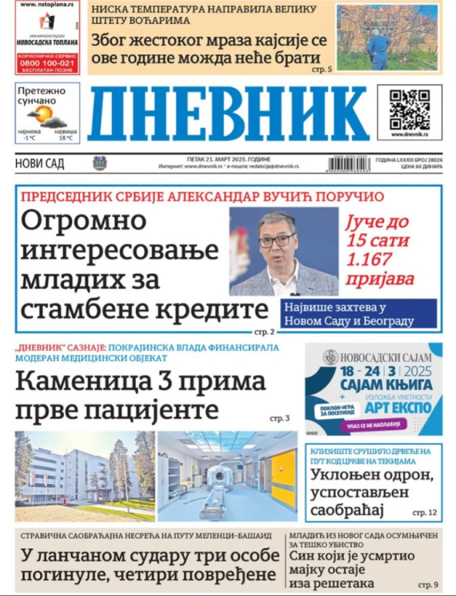 Naslovne strane dnevnih novina: Prelistavanje štampe za 21. mart 2025. godine
