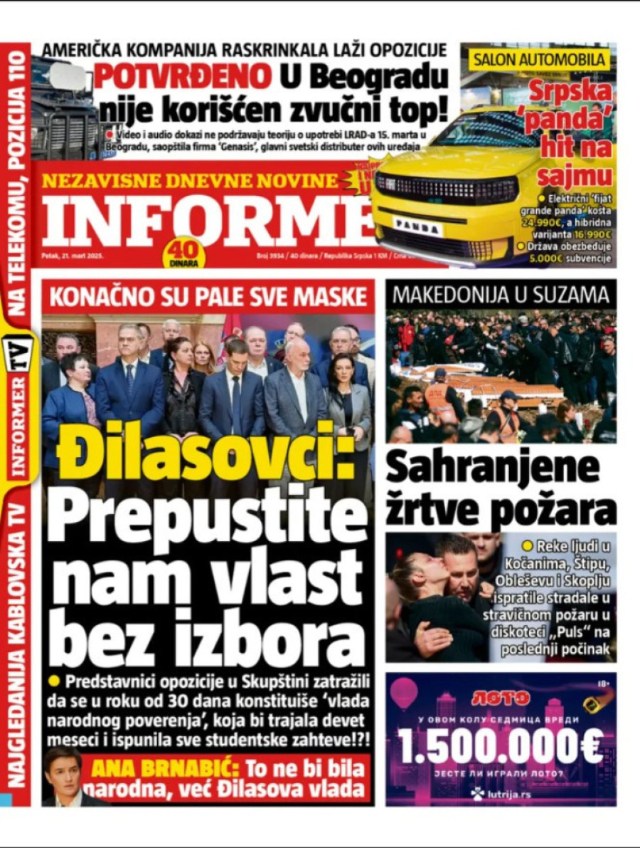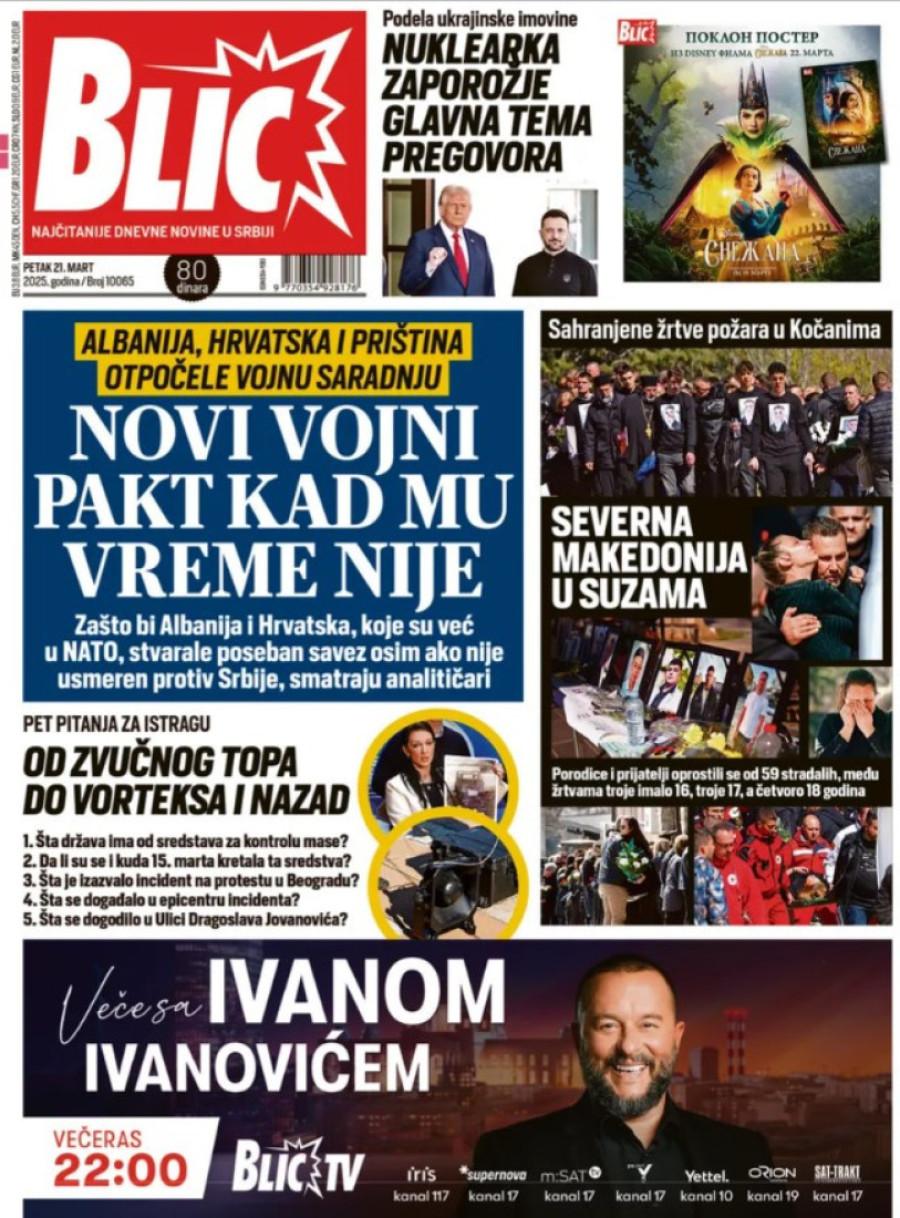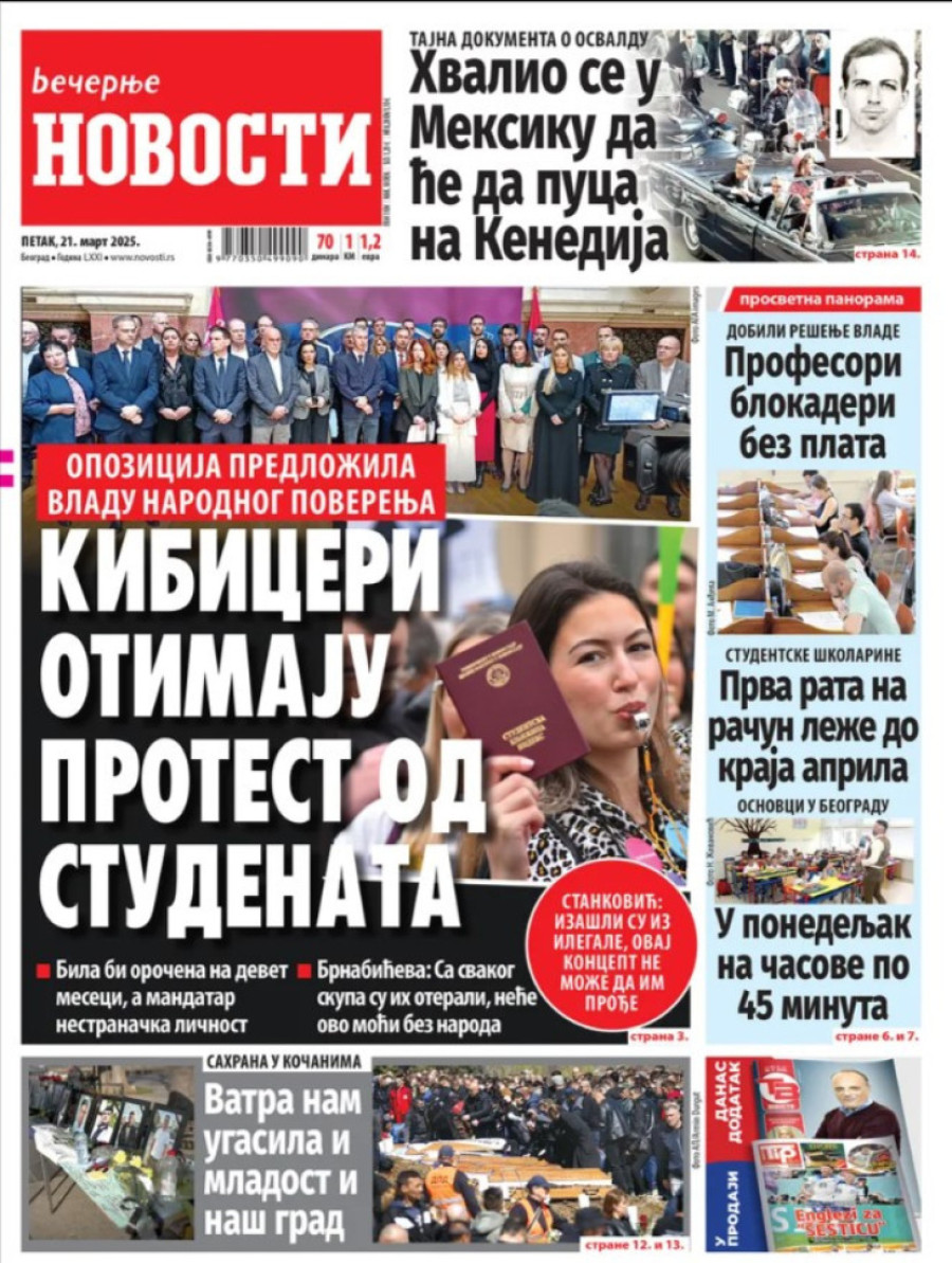 Dnevne novine u Srbiji za petak 21. mart 2025. godine na naslovnim stranama najavljuju brojne aktuelne društveno-političke teme.