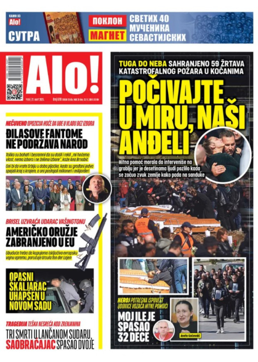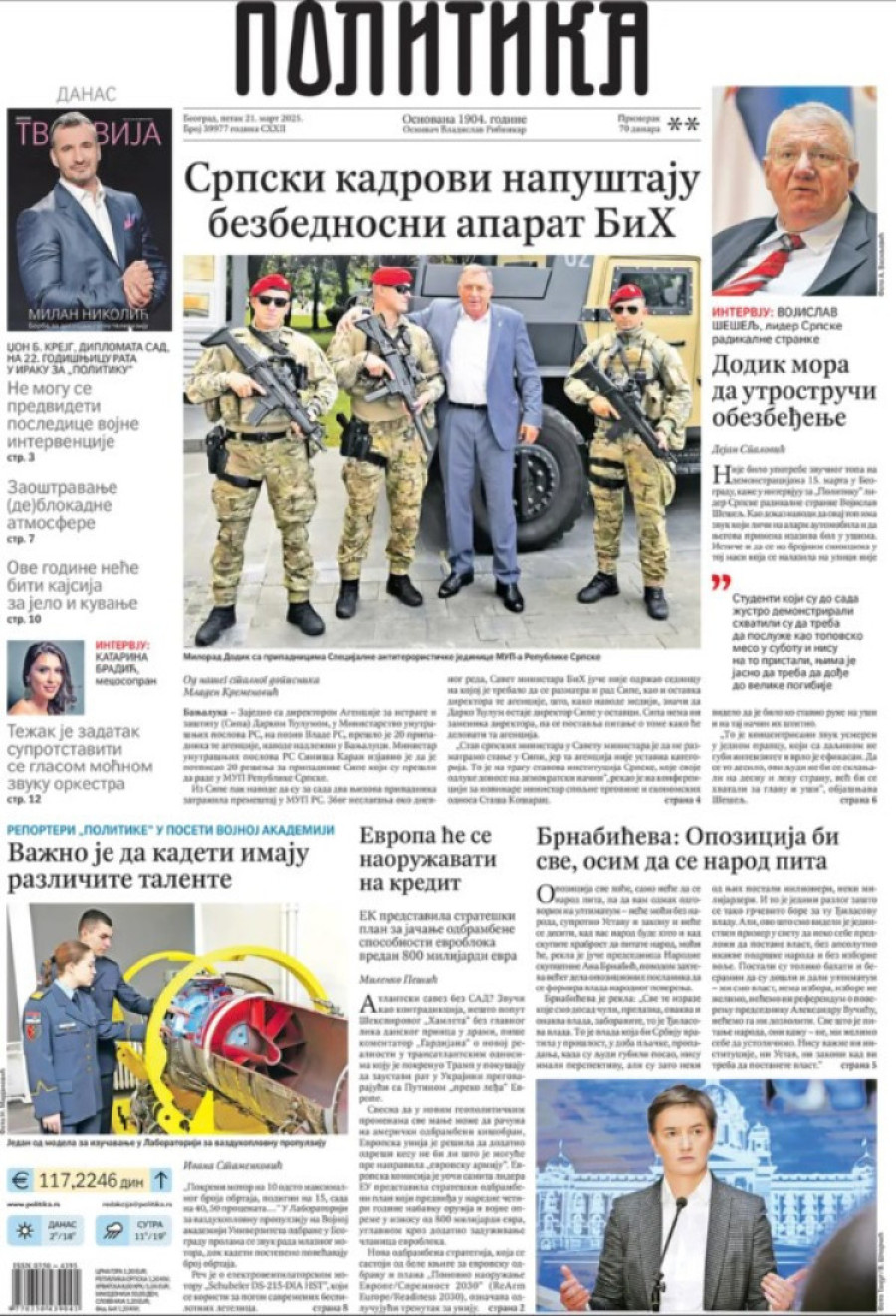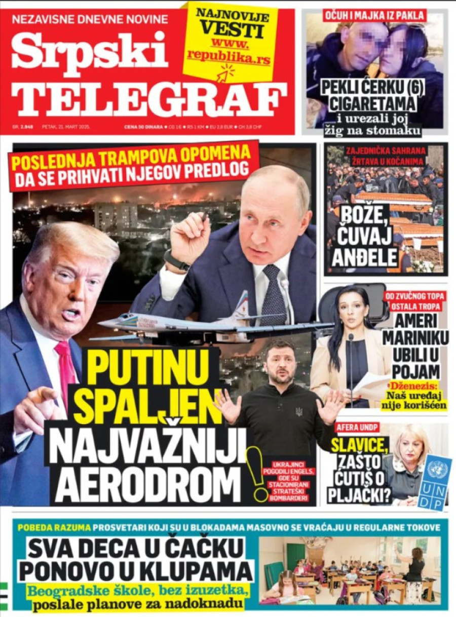 Dnevne novine u Srbiji za petak 21. mart 2025. godine na naslovnim stranama najavljuju brojne aktuelne društveno-političke teme.