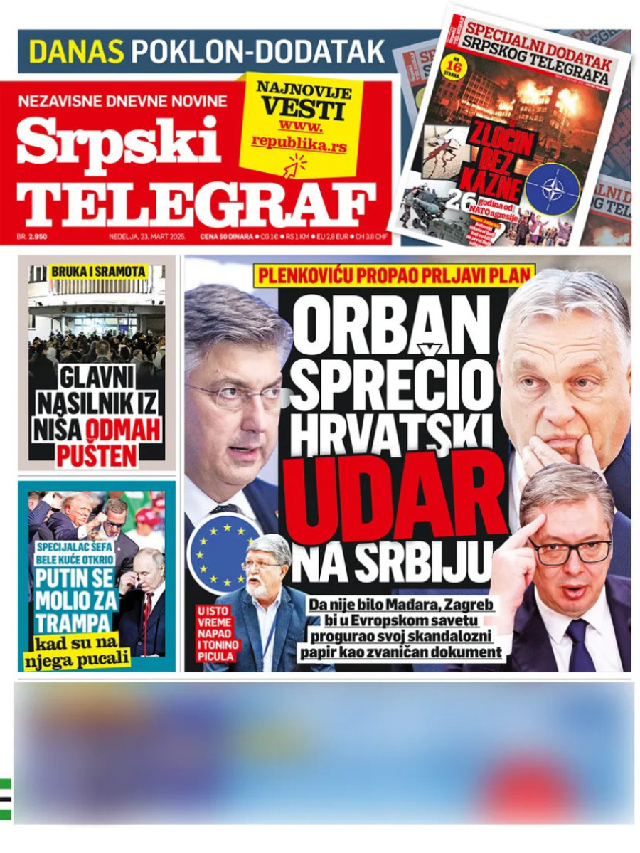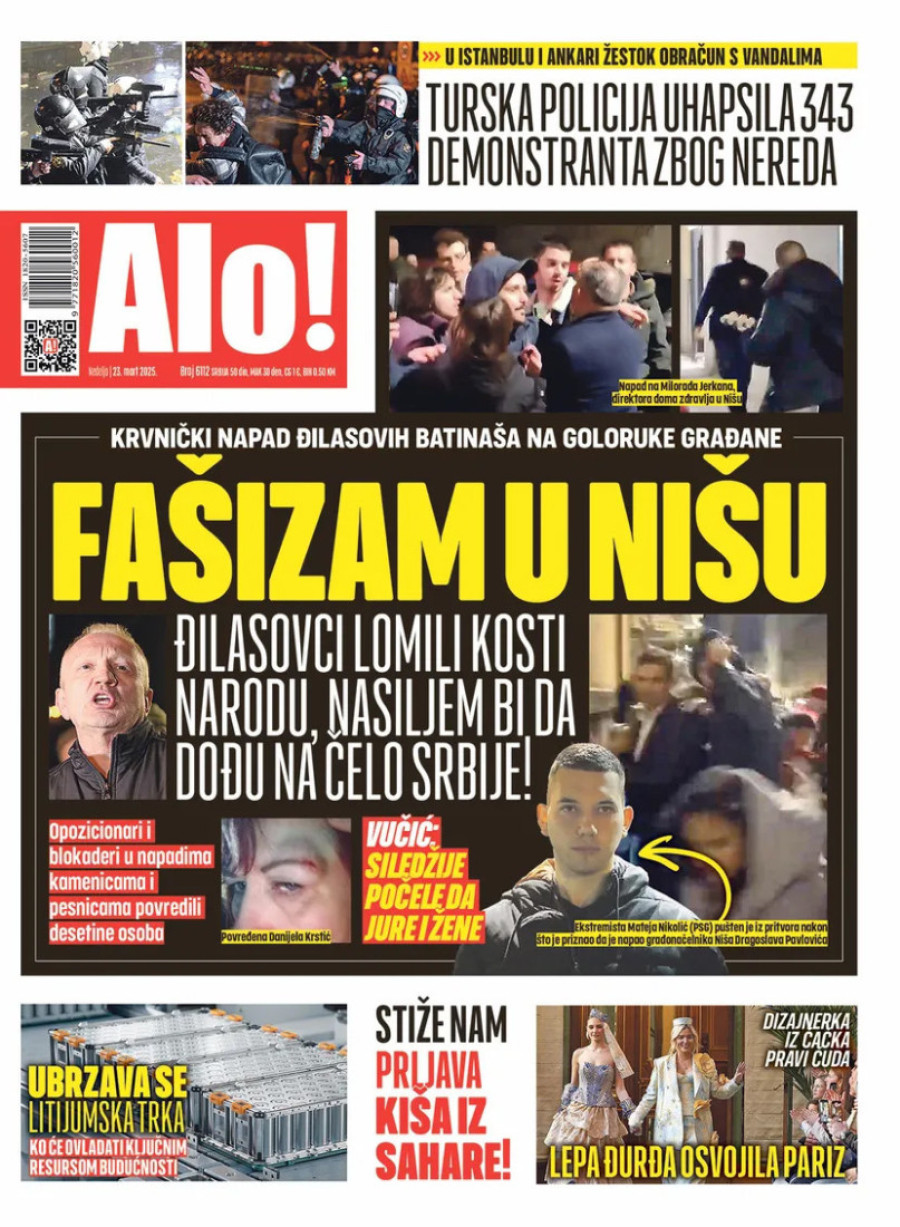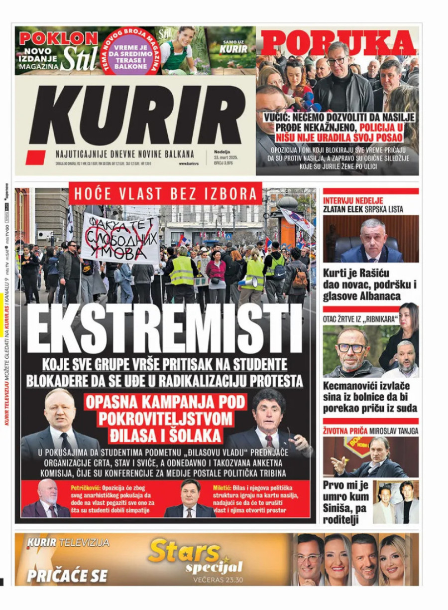 Dnevne novine u Srbiji za nedelju 23. mart 2025. godine na naslovnim stranama najavljuju brojne aktuelne društveno-političke teme.