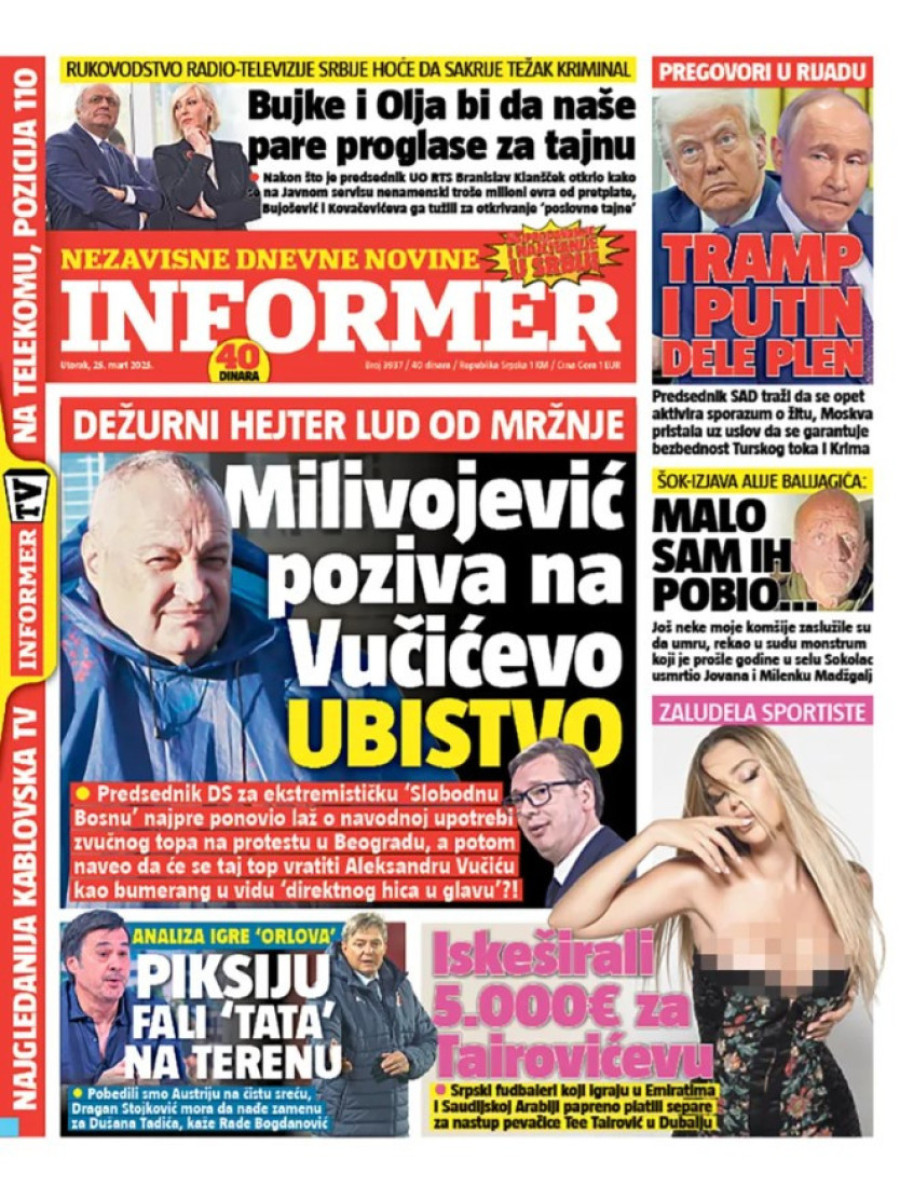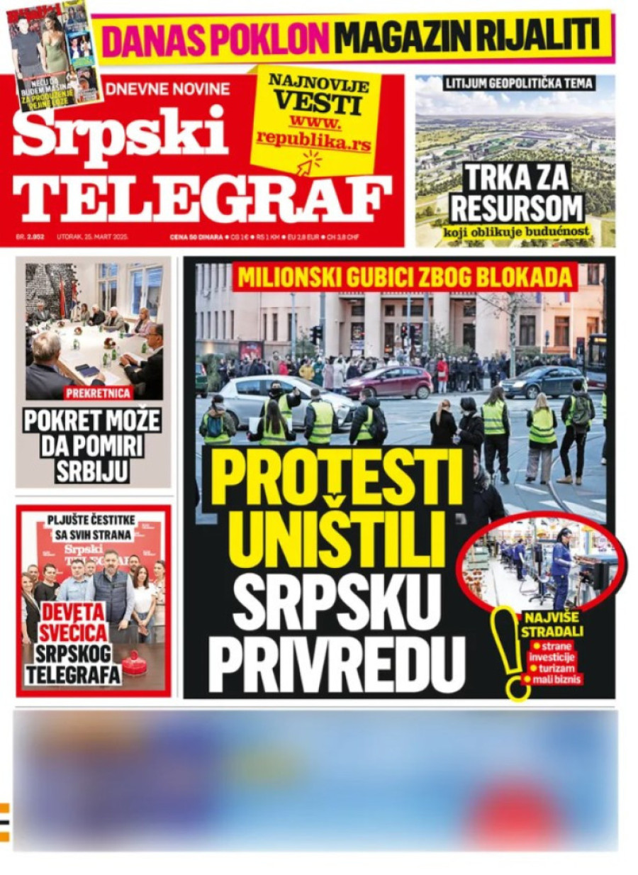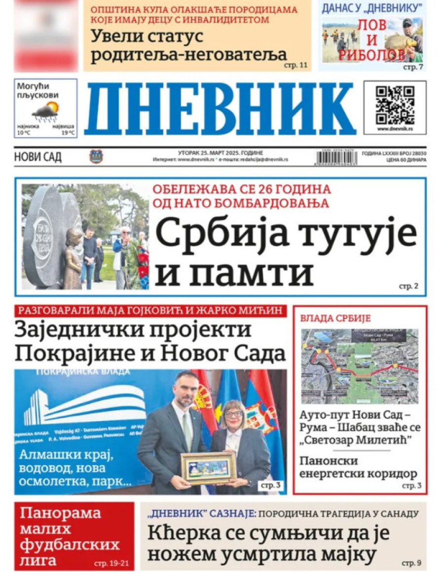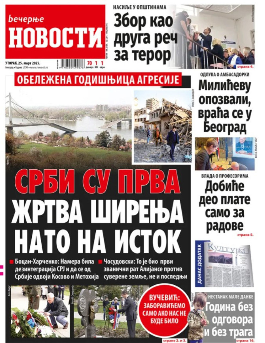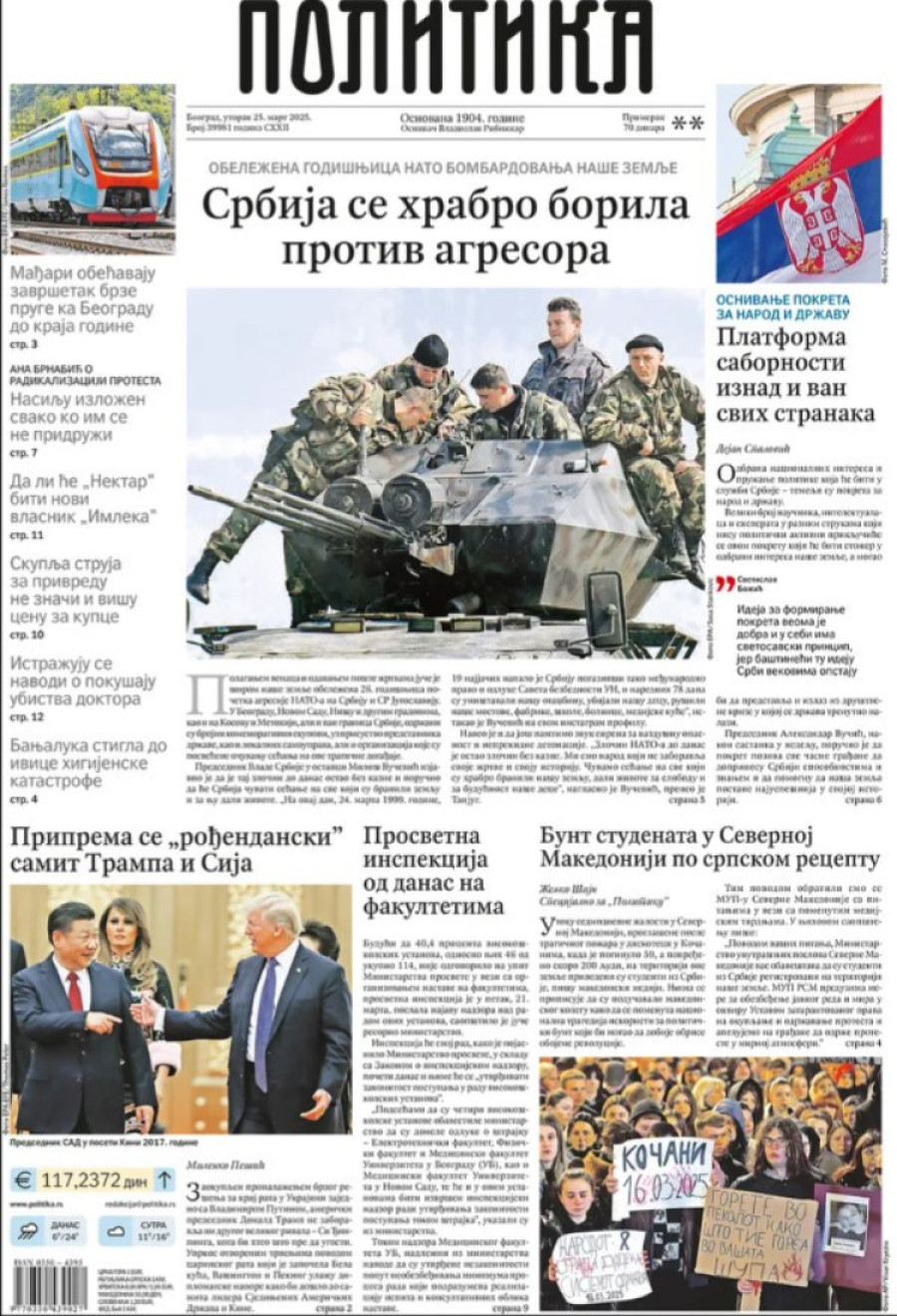 Dnevne novine u Srbiji za utorak 25. mart 2025. godine na naslovnim stranama najavljuju brojne aktuelne društveno-političke teme.