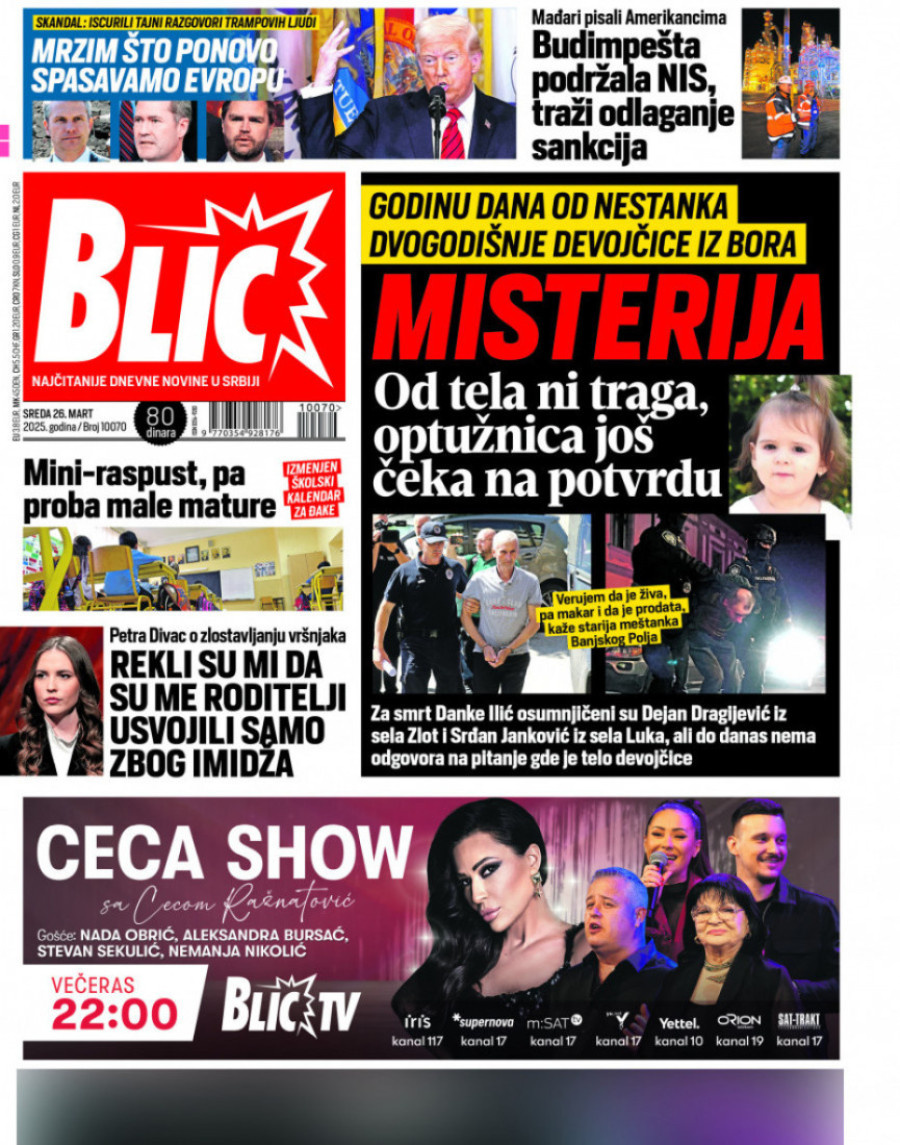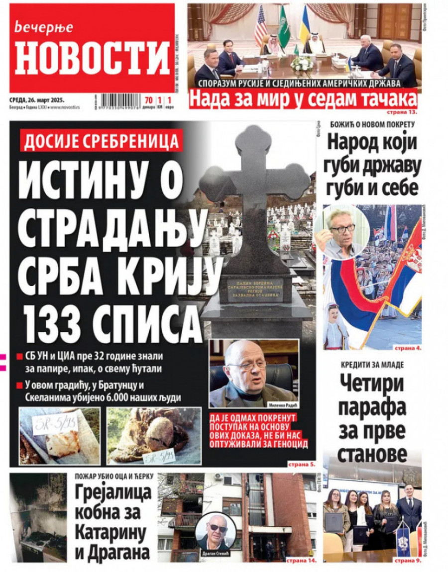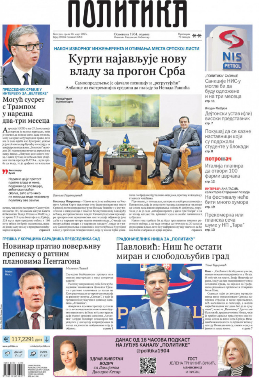 Dnevne novine u Srbiji za sredu 26. mart 2025. godine na naslovnim stranama najavljuju brojne aktuelne društveno-političke teme.