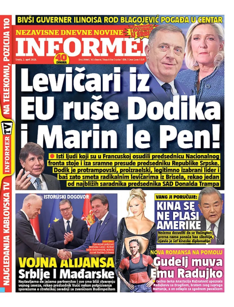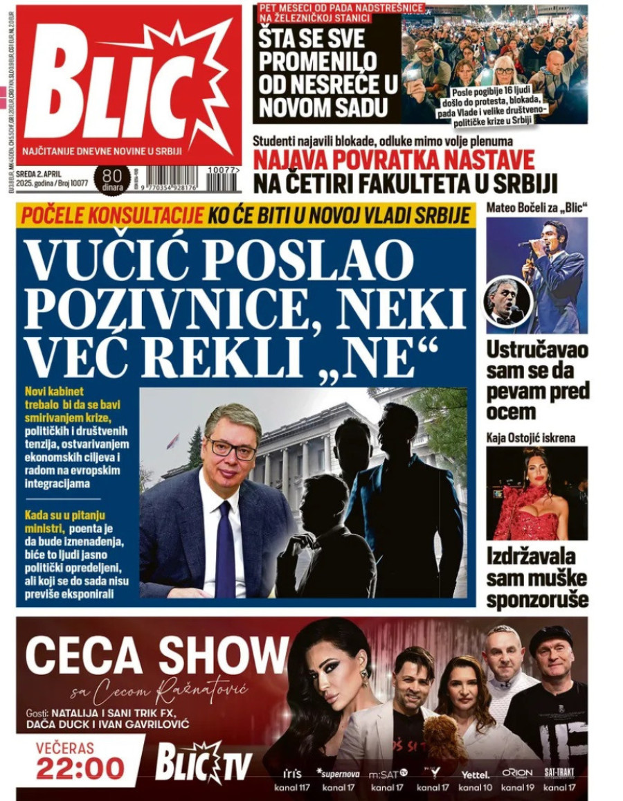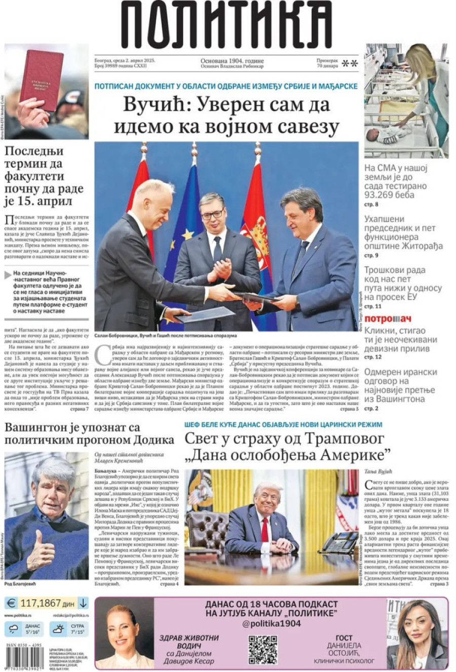 Dnevne novine u Srbiji za sredu 2. april 2025. godine na naslovnim stranama najavljuju brojne aktuelne društveno-političke teme.