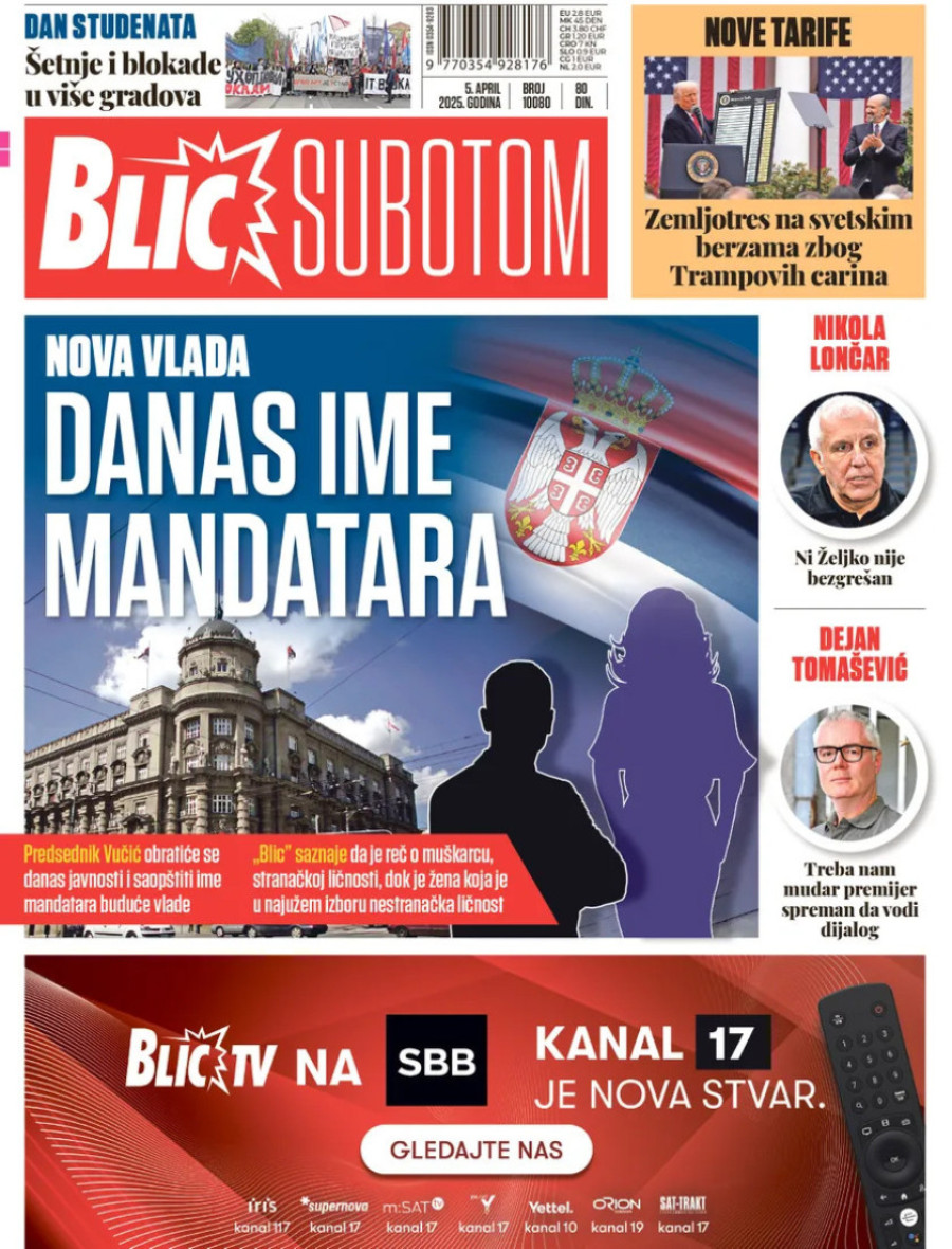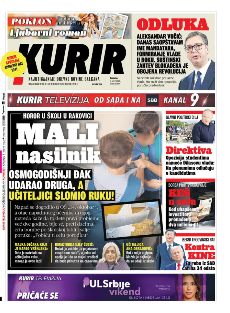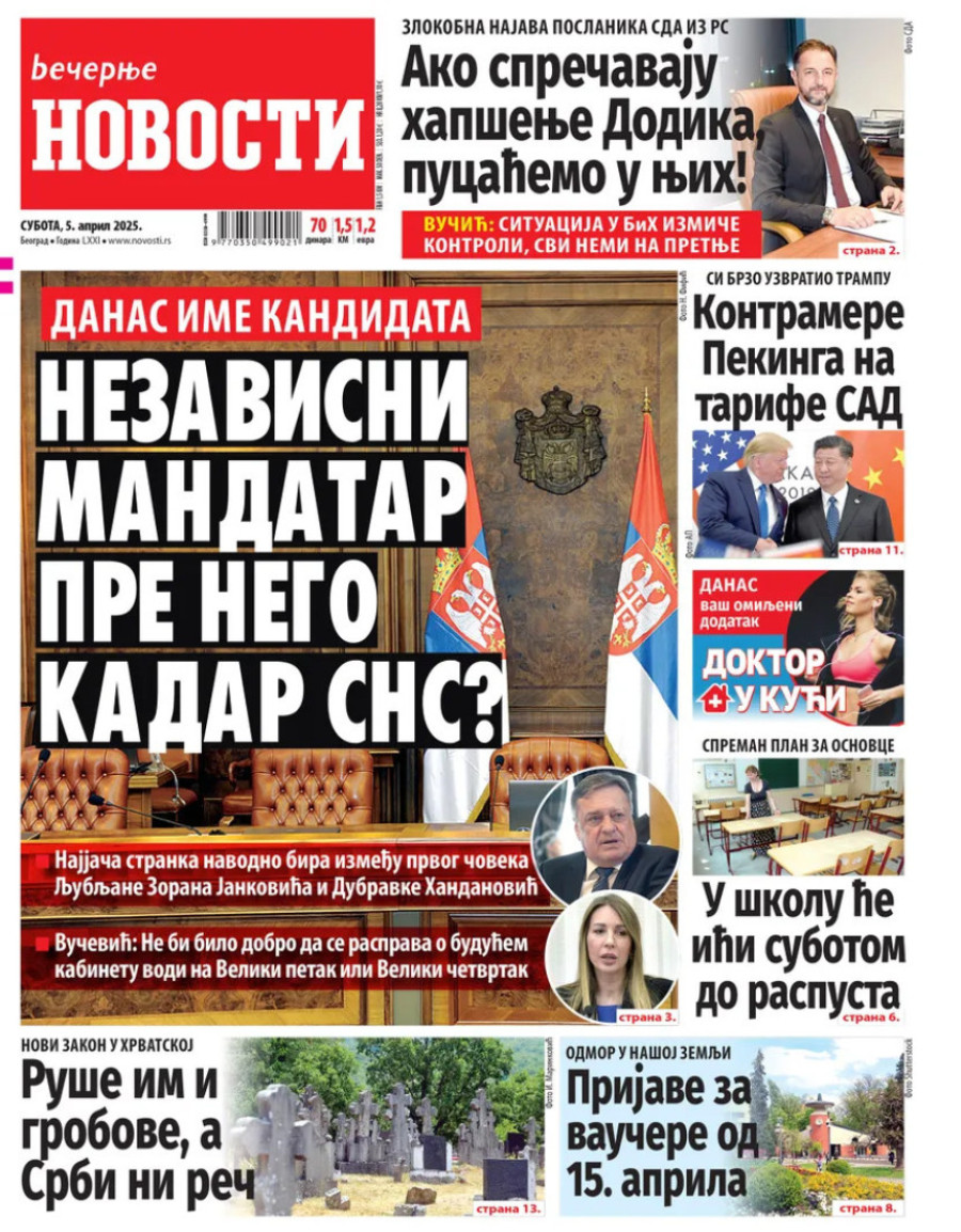 Dnevne novine u Srbiji za subotu 5. april 2025. godine na naslovnim stranama najavljuju brojne aktuelne društveno-političke teme.
