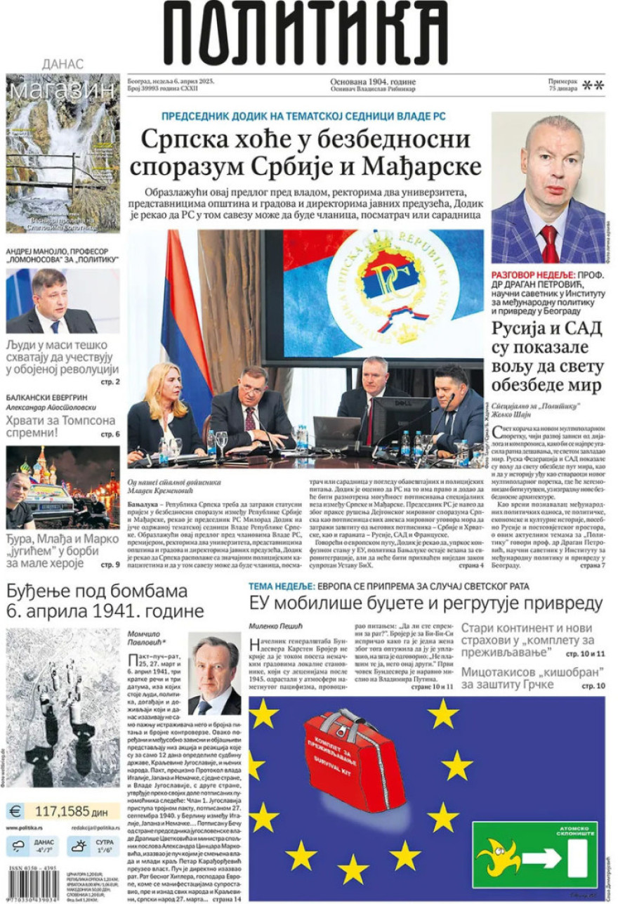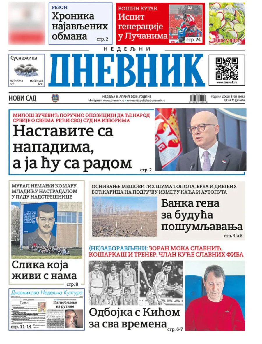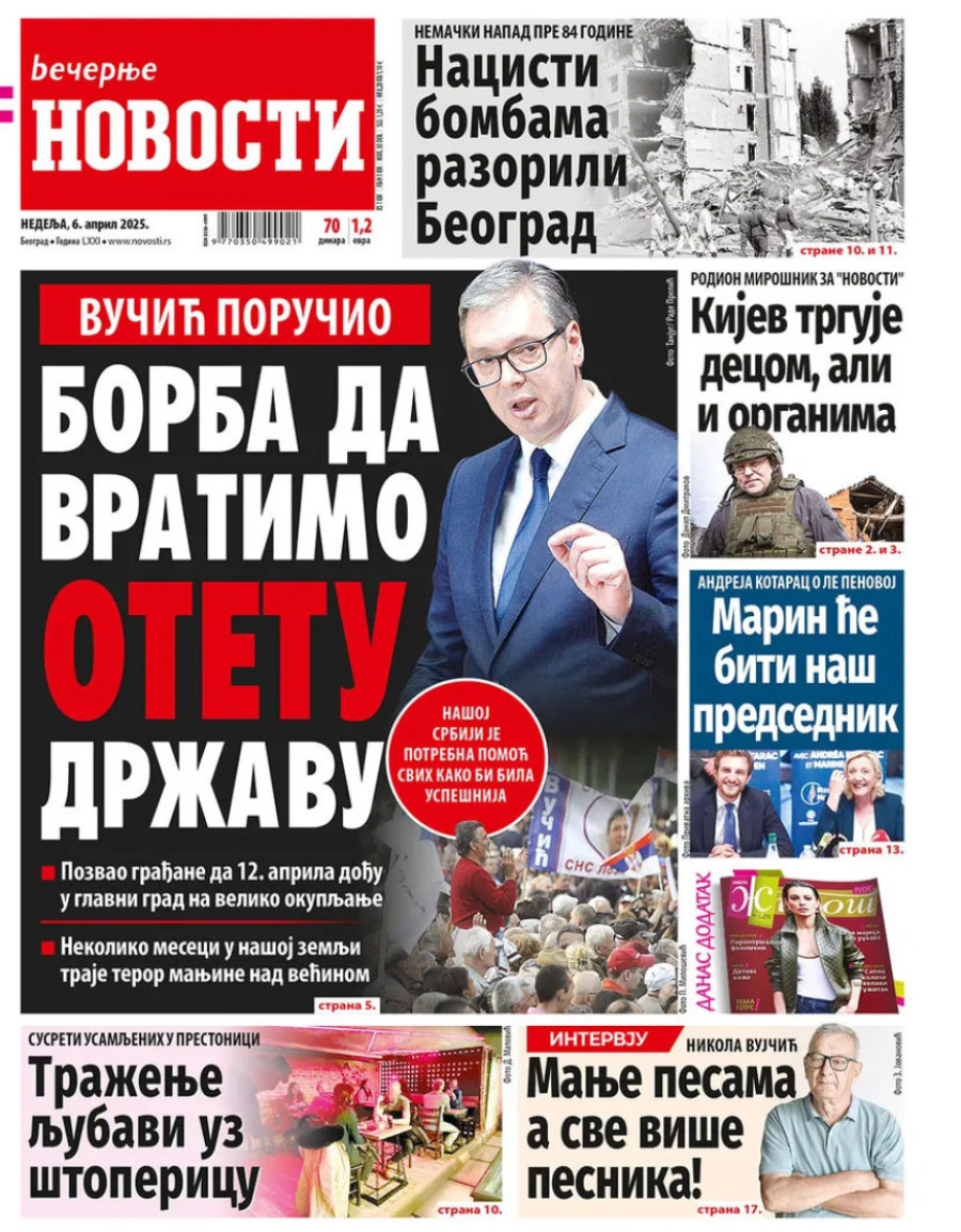 Dnevne novine u Srbiji za nedelju 6. april 2025. godine na naslovnim stranama najavljuju brojne aktuelne društveno-političke teme.