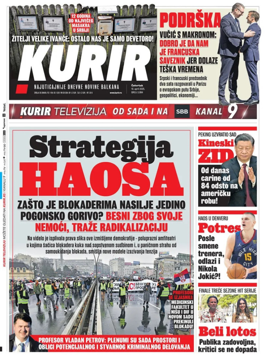 Dnevne novine u Srbiji za sredu 9. april 2025. godine na naslovnim stranama najavljuju brojne aktuelne društveno-političke teme.