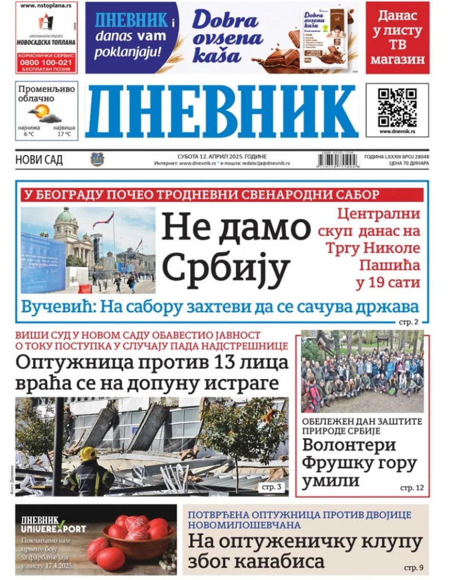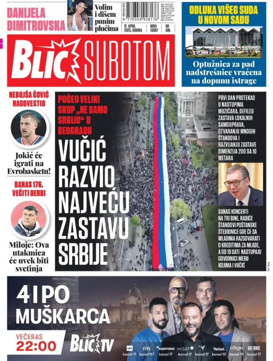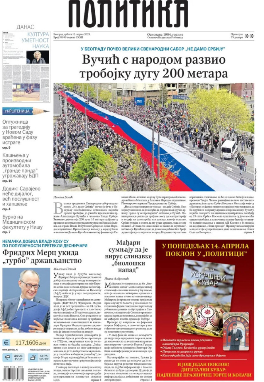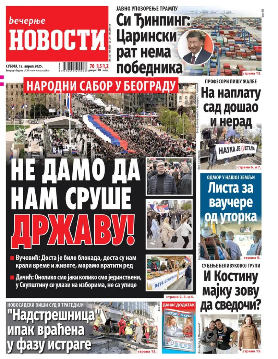 Dnevne novine u Srbiji za subotu 12. april 2025. godine na naslovnim stranama najavljuju brojne aktuelne društveno-političke teme.