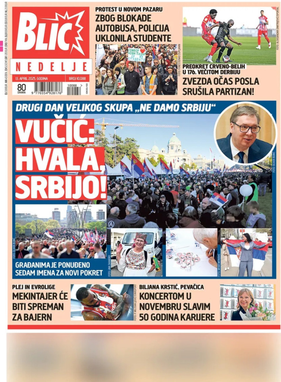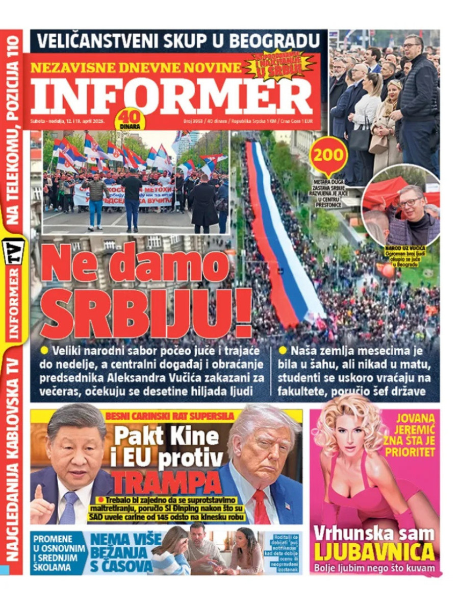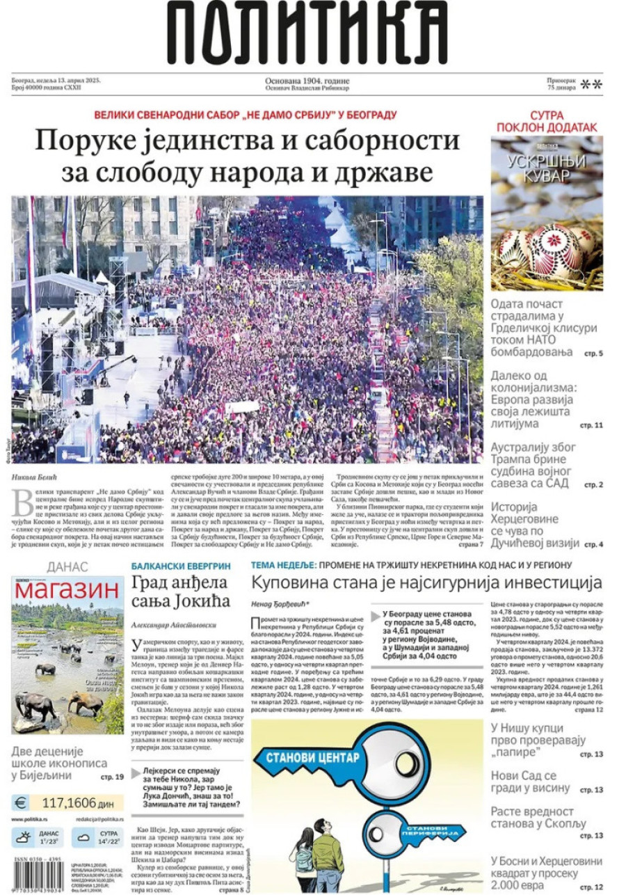 Dnevne novine u Srbiji za nedelju 13. april 2025. godine na naslovnim stranama najavljuju brojne aktuelne društveno-političke teme.