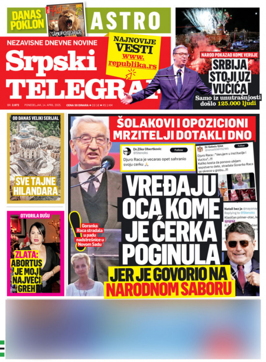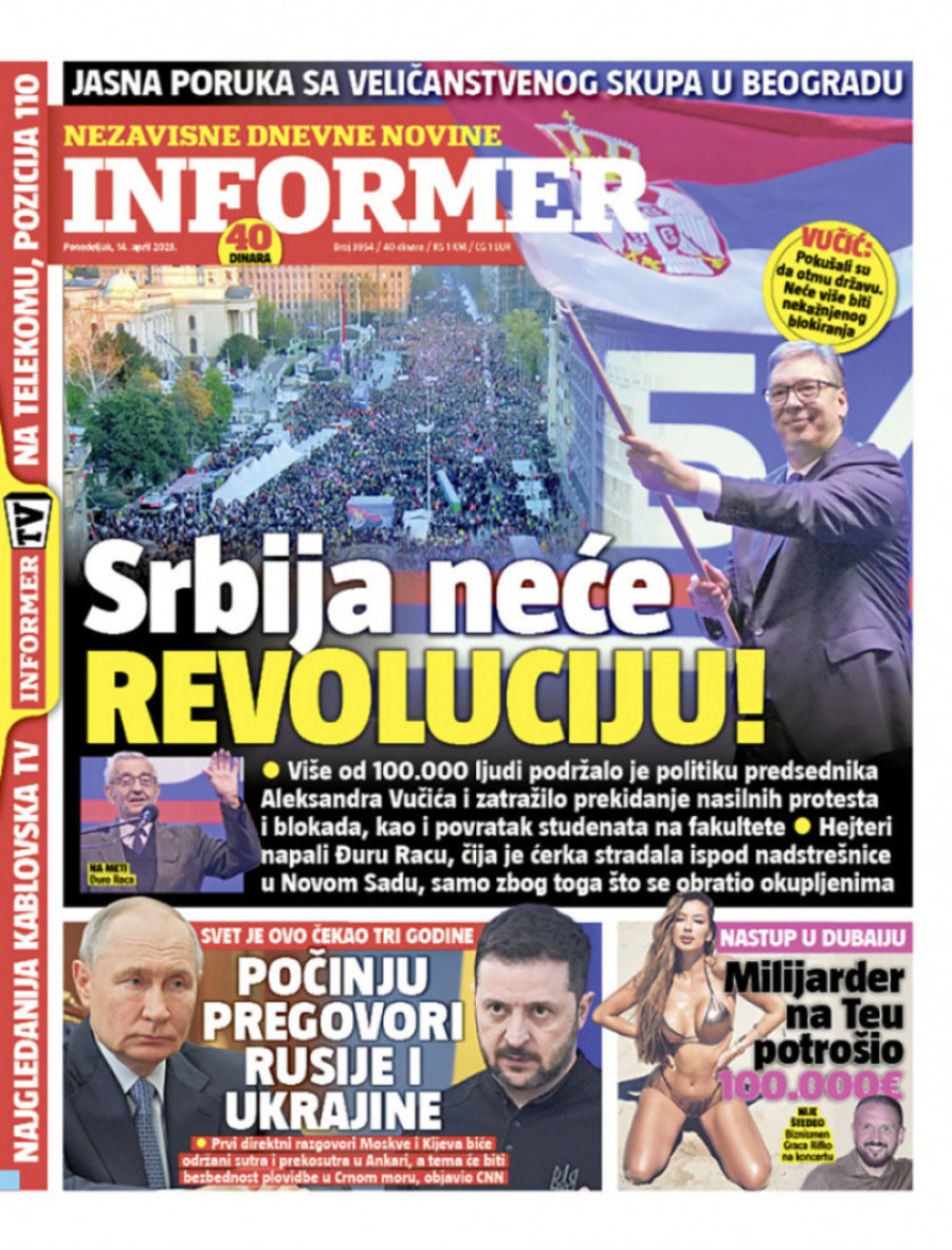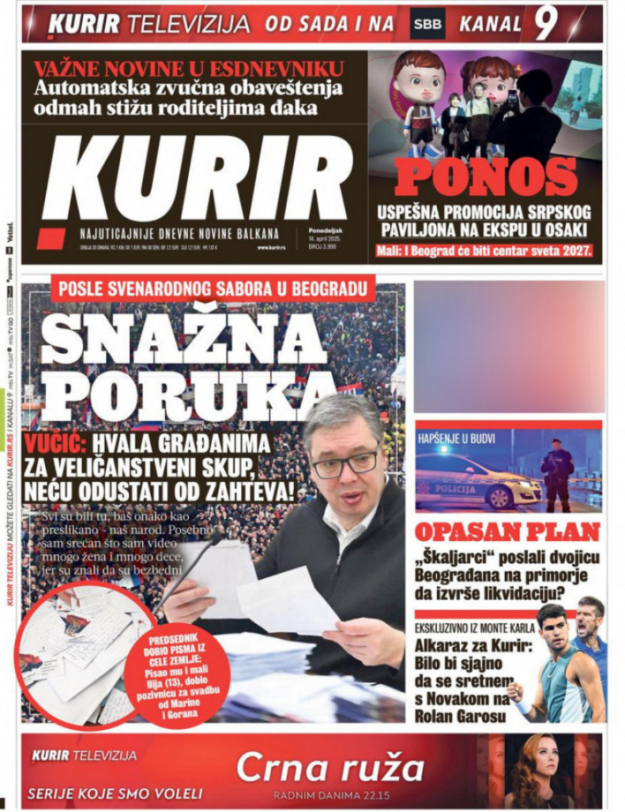Dnevne novine u Srbiji za ponedeljak 14. april 2025. godine na naslovnim stranama najavljuju brojne aktuelne društveno-političke teme.