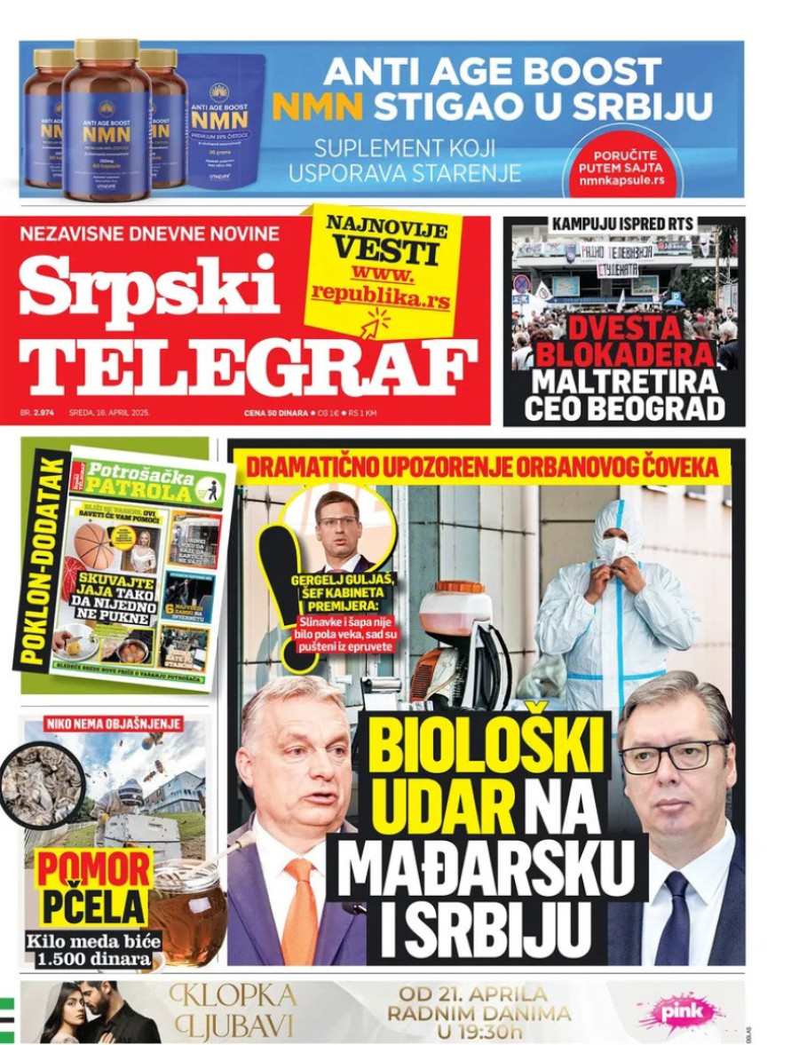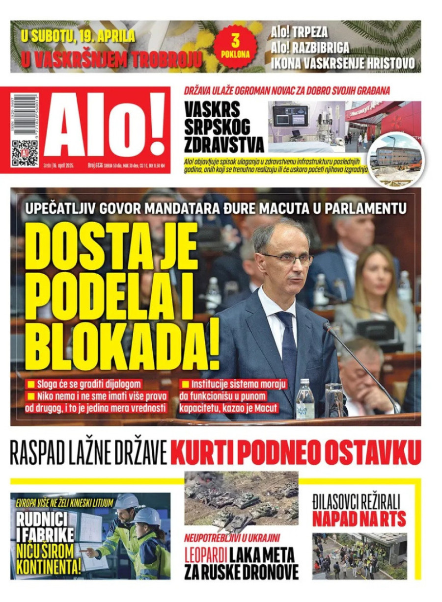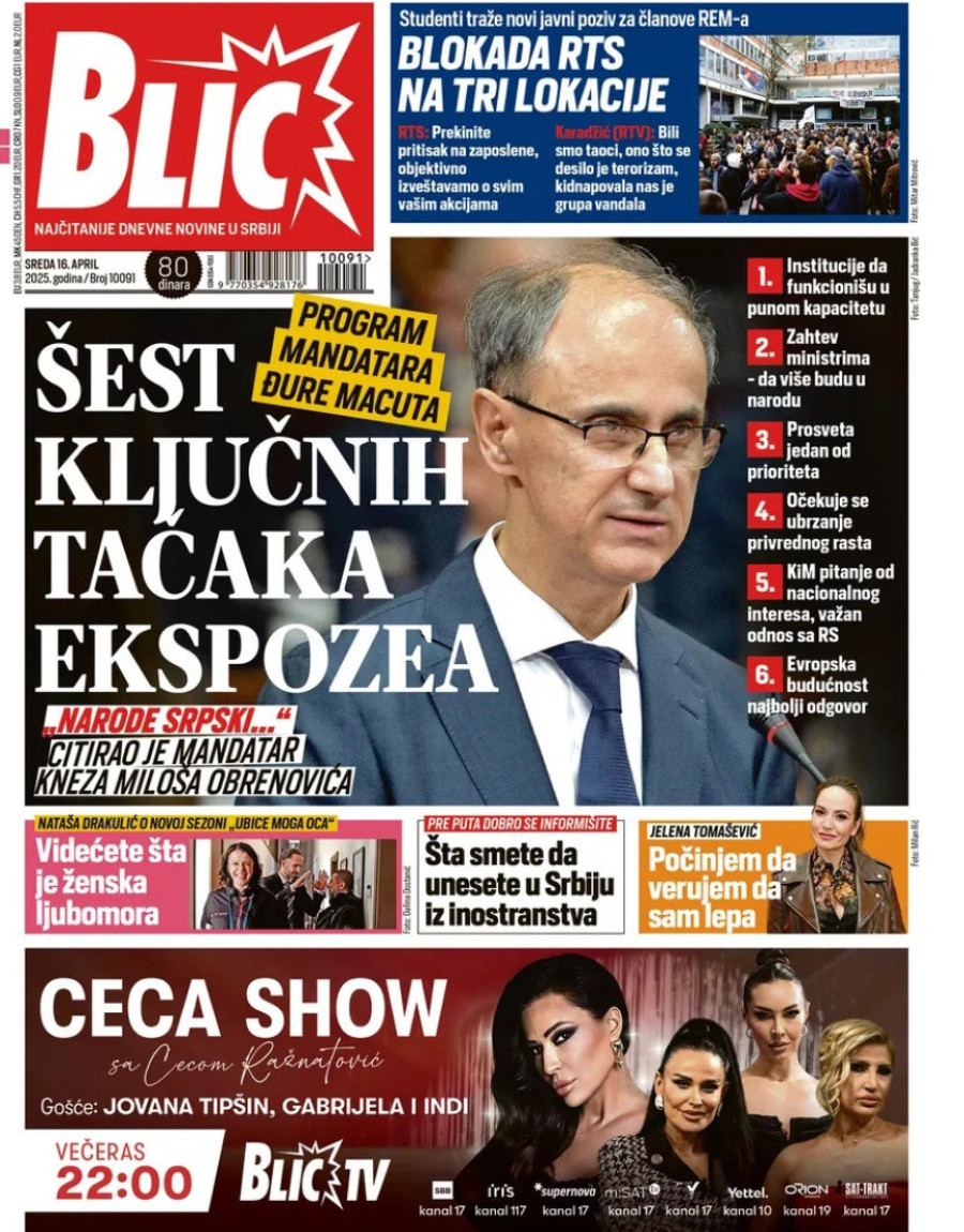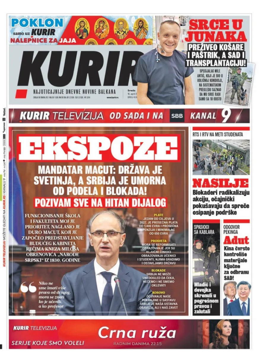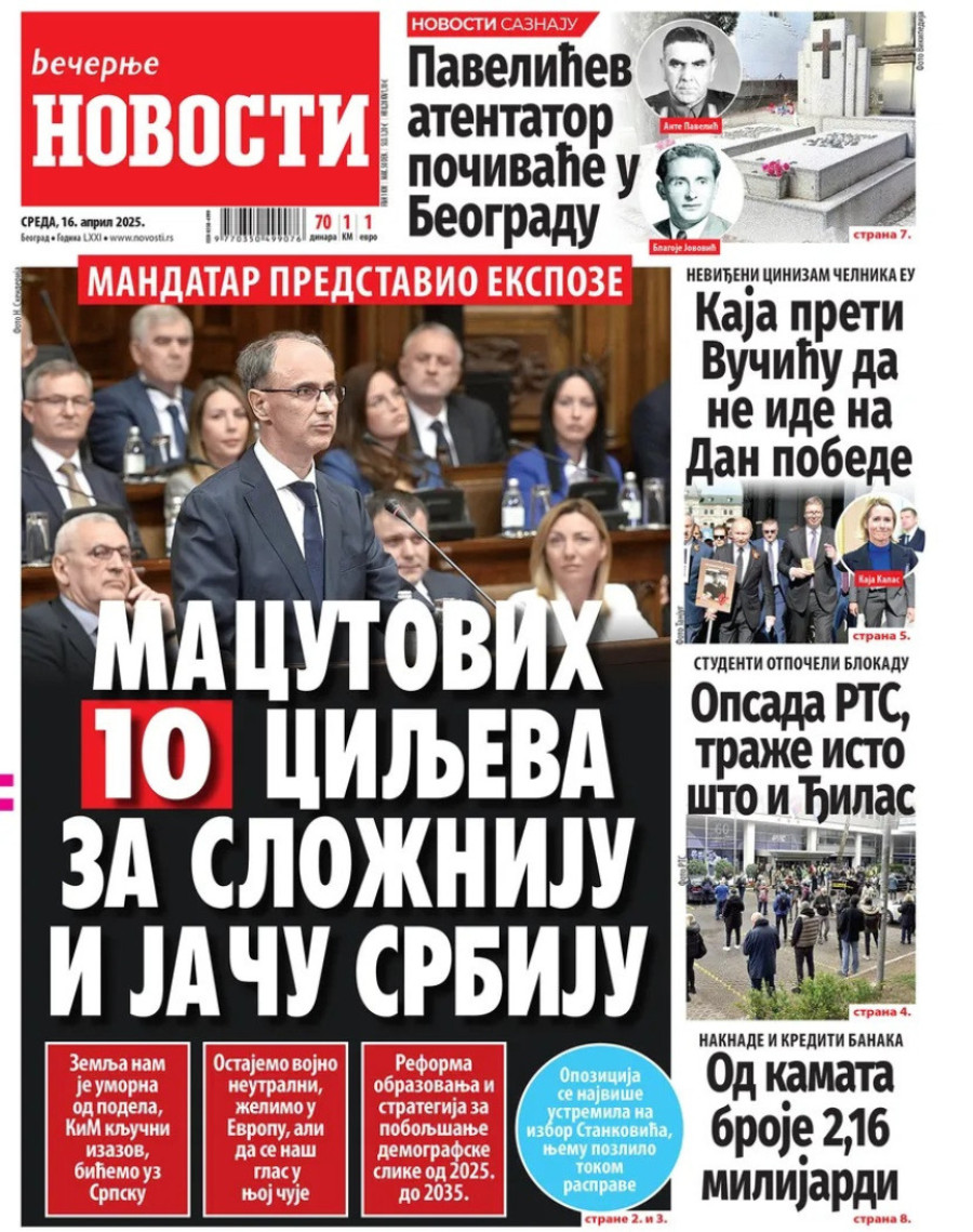 Dnevne novine u Srbiji za sredu, 16. april 2025. godine, na naslovnim stranama najavljuju brojne aktuelne društveno-političke teme.