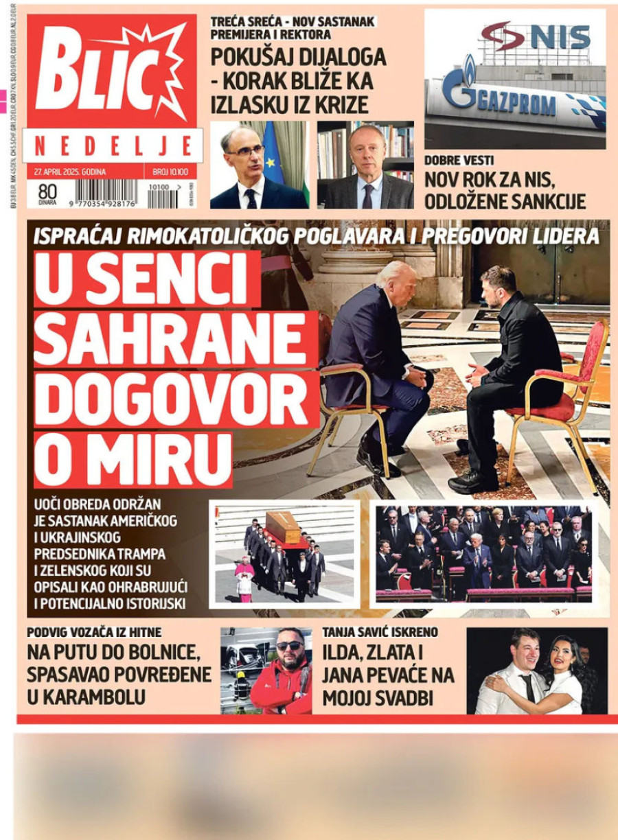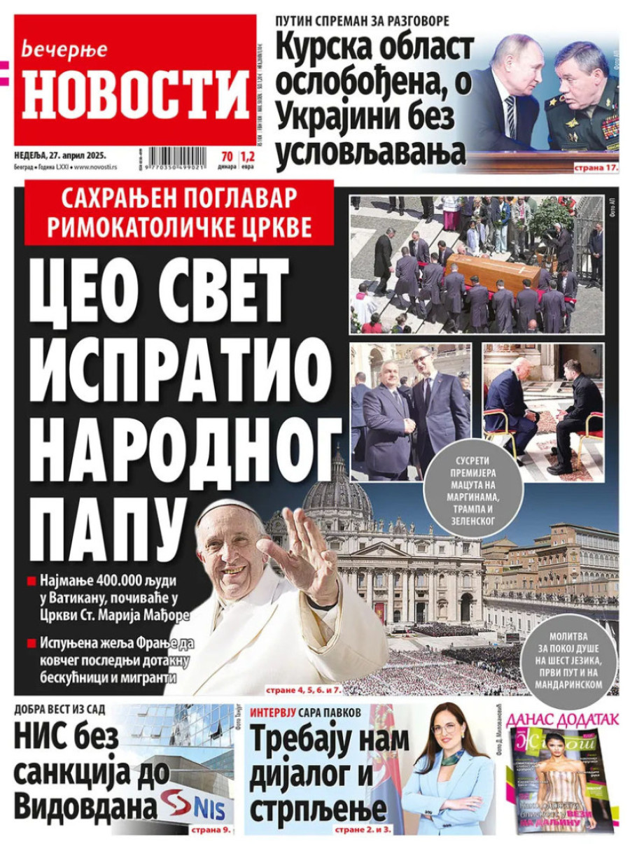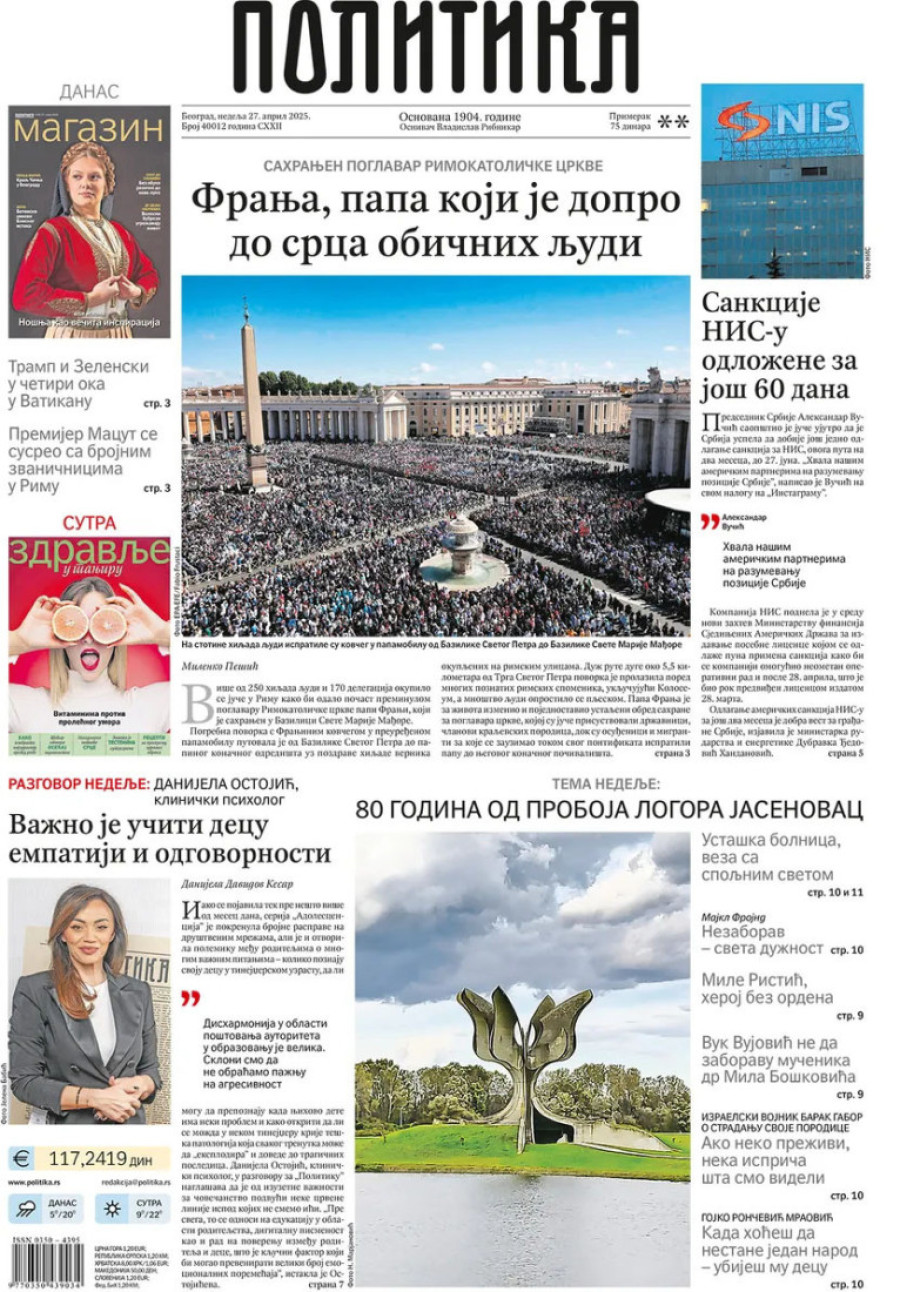 Dnevne novine u Srbiji za nedelju, 27. april 2025. godine, na naslovnim stranama najavljuju brojne aktuelne društveno-političke teme.