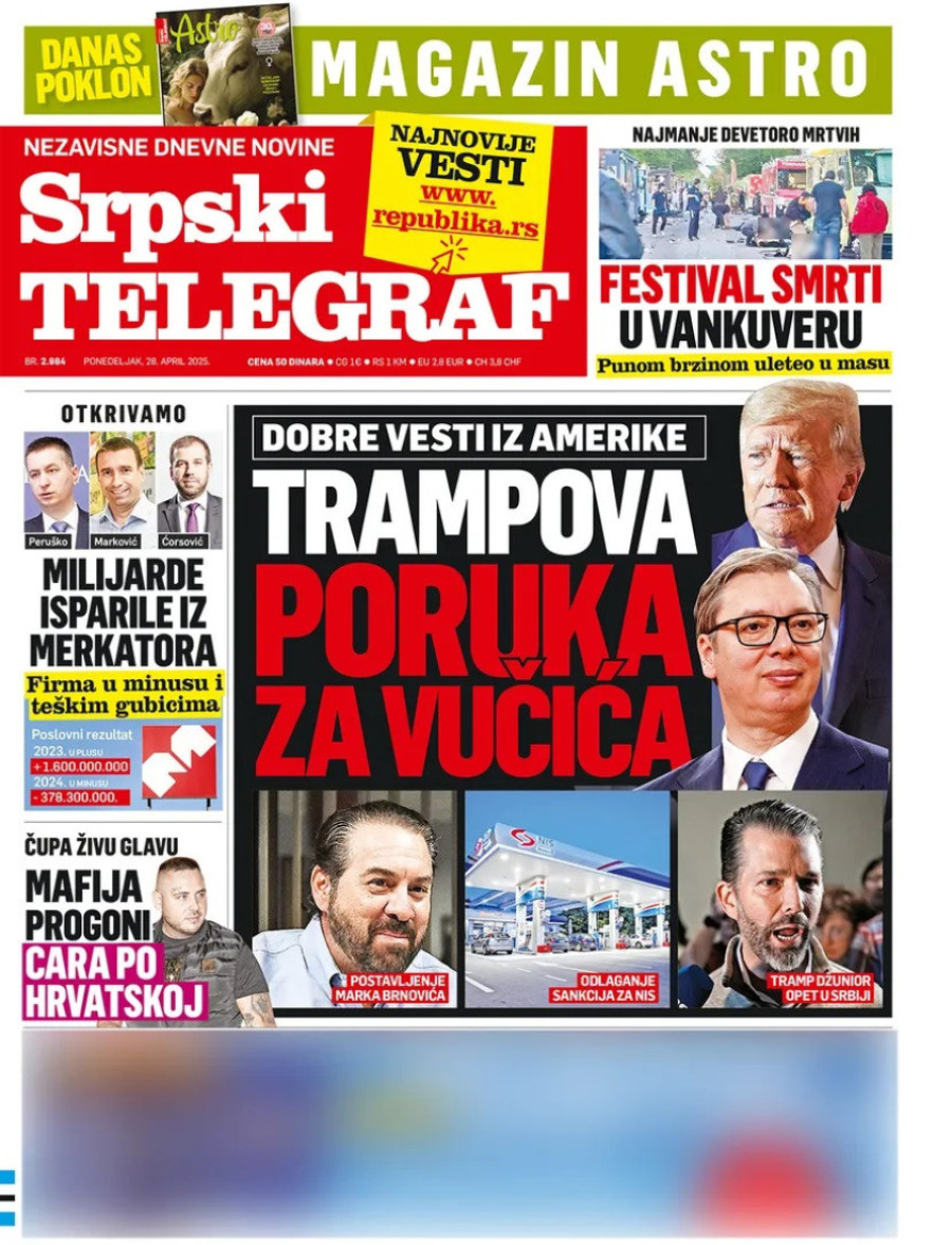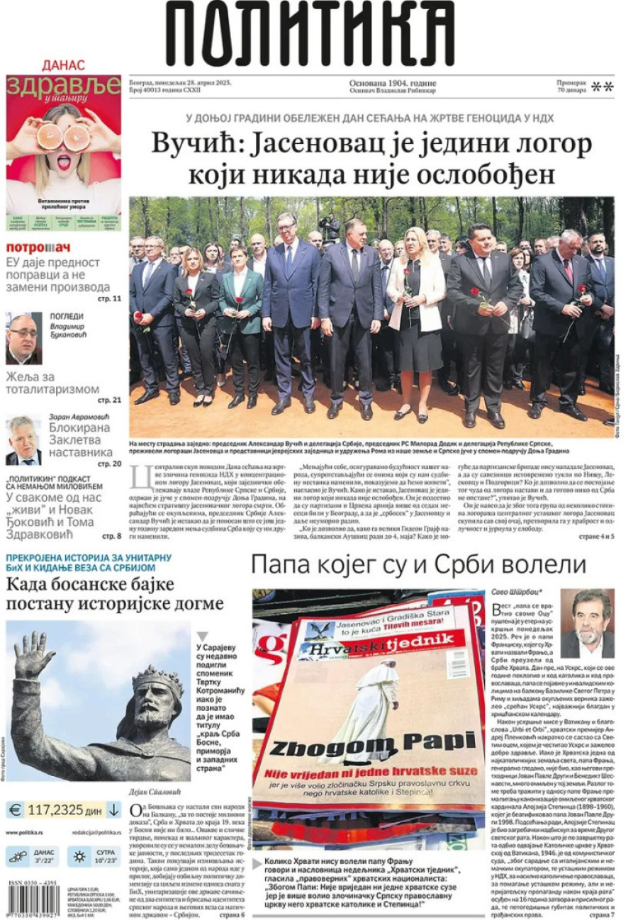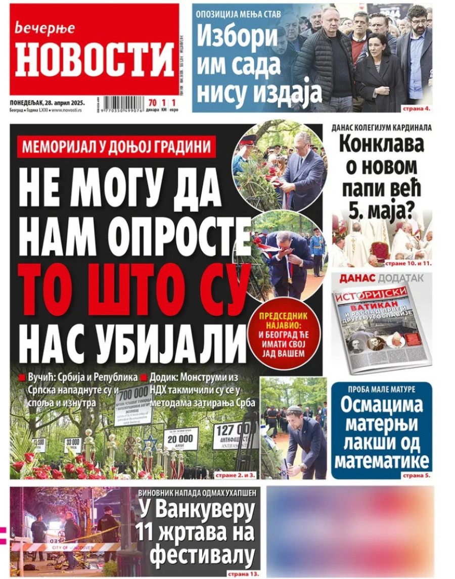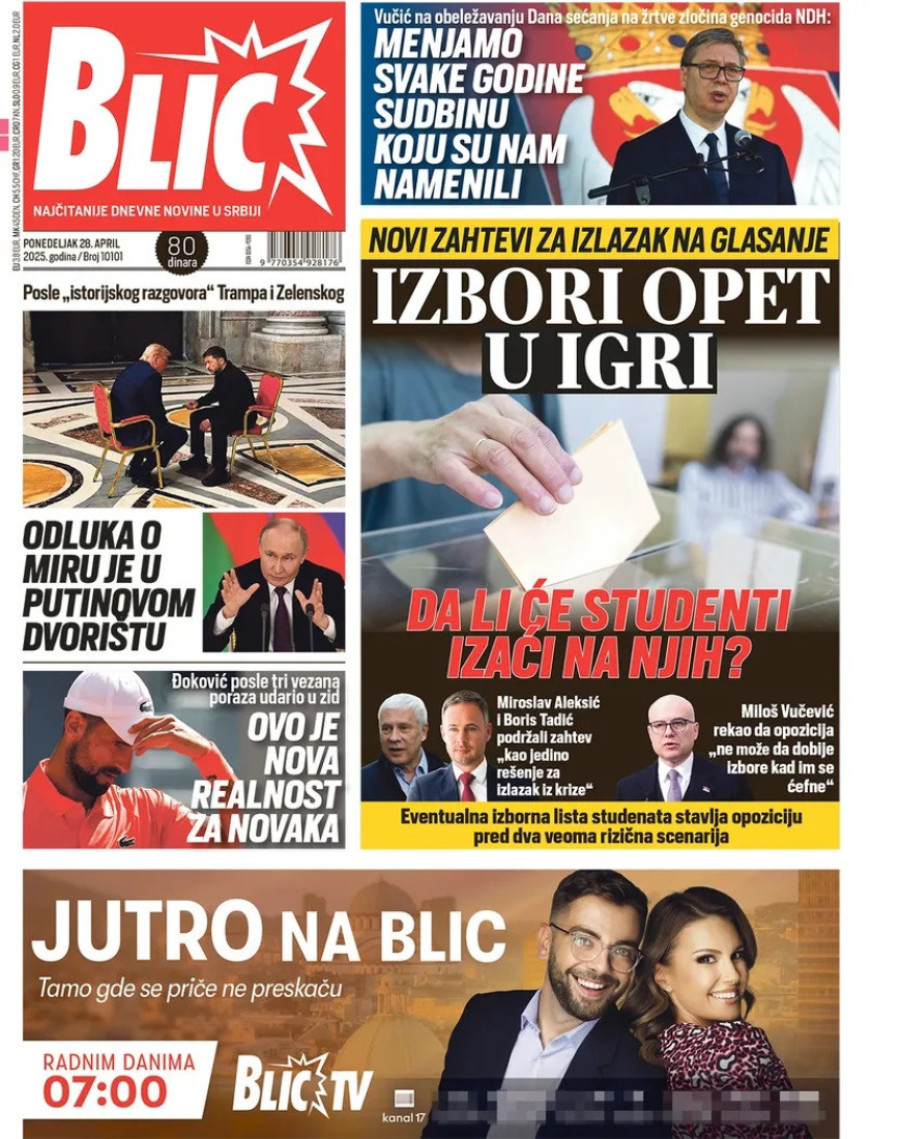 Dnevne novine u Srbiji za ponedeljak 28. april 2025. godine, na naslovnim stranama najavljuju brojne aktuelne društveno-političke teme.