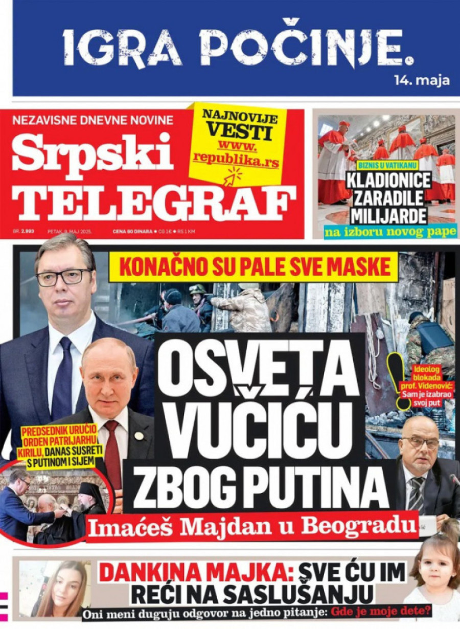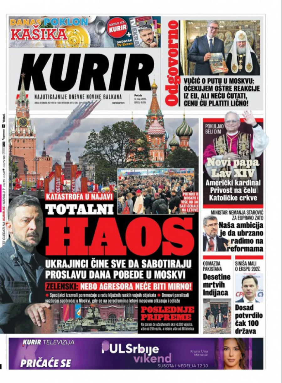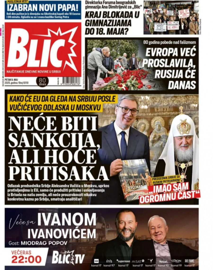 Dnevne novine u Srbiji za petak, 9. maj 2025. godine, na naslovnim stranama najavljuju brojne aktuelne društveno-političke teme.