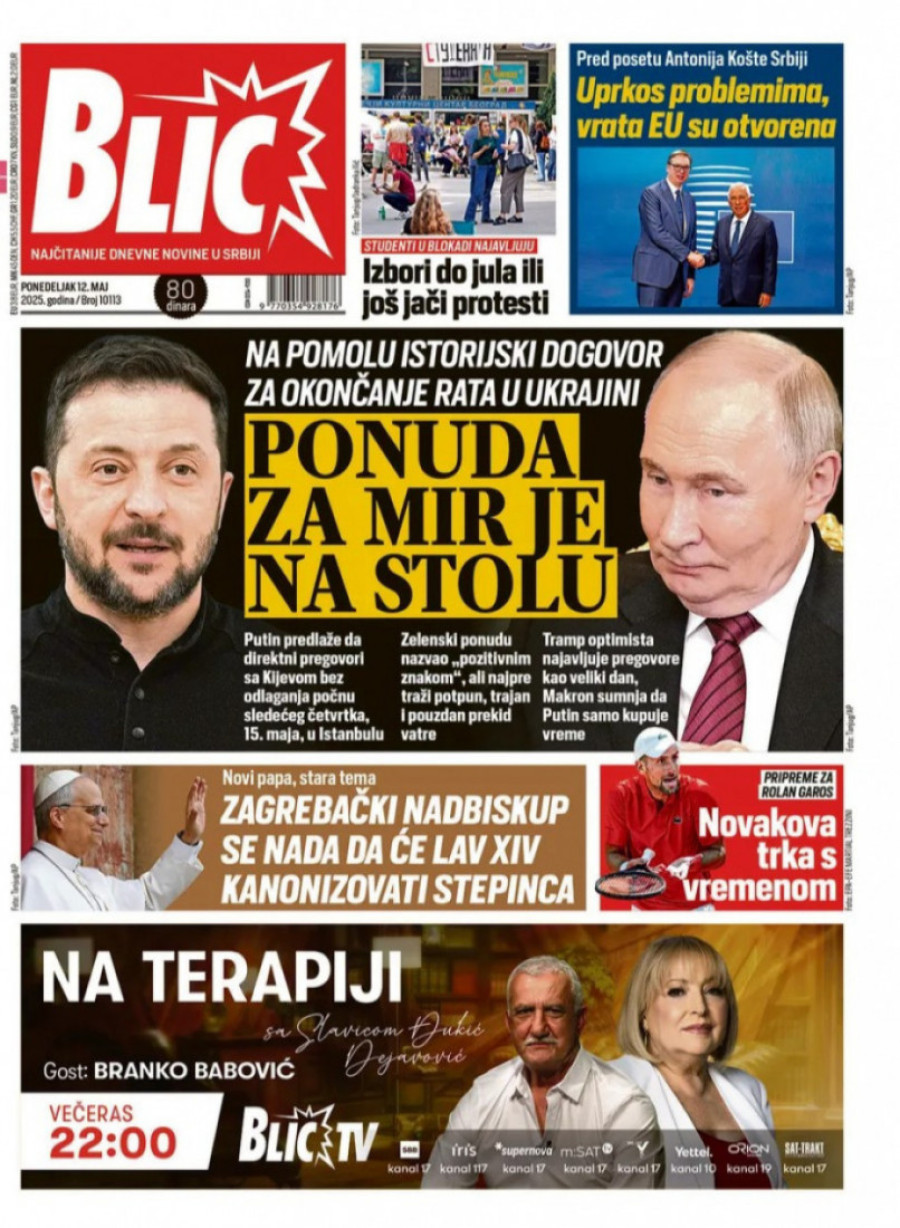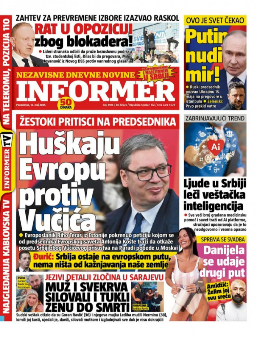Dnevne novine u Srbiji za ponedeljak, 12. maj 2025. godine, na naslovnim stranama najavljuju brojne aktuelne društveno-političke teme.
